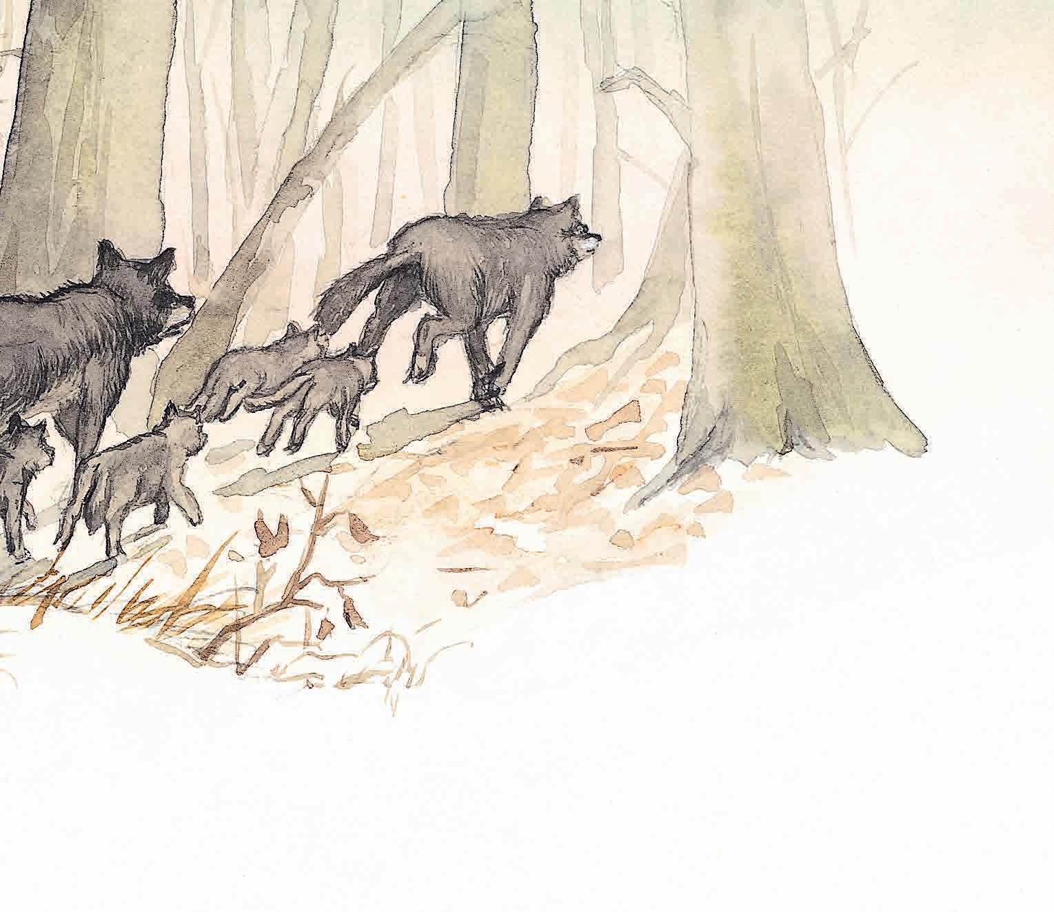 Les cinq louveteaux se mirent à courir aussi vite que possible. La nuit tombait et la forêt était si sombre qu’on ne distinguait plus le moindre sentier.