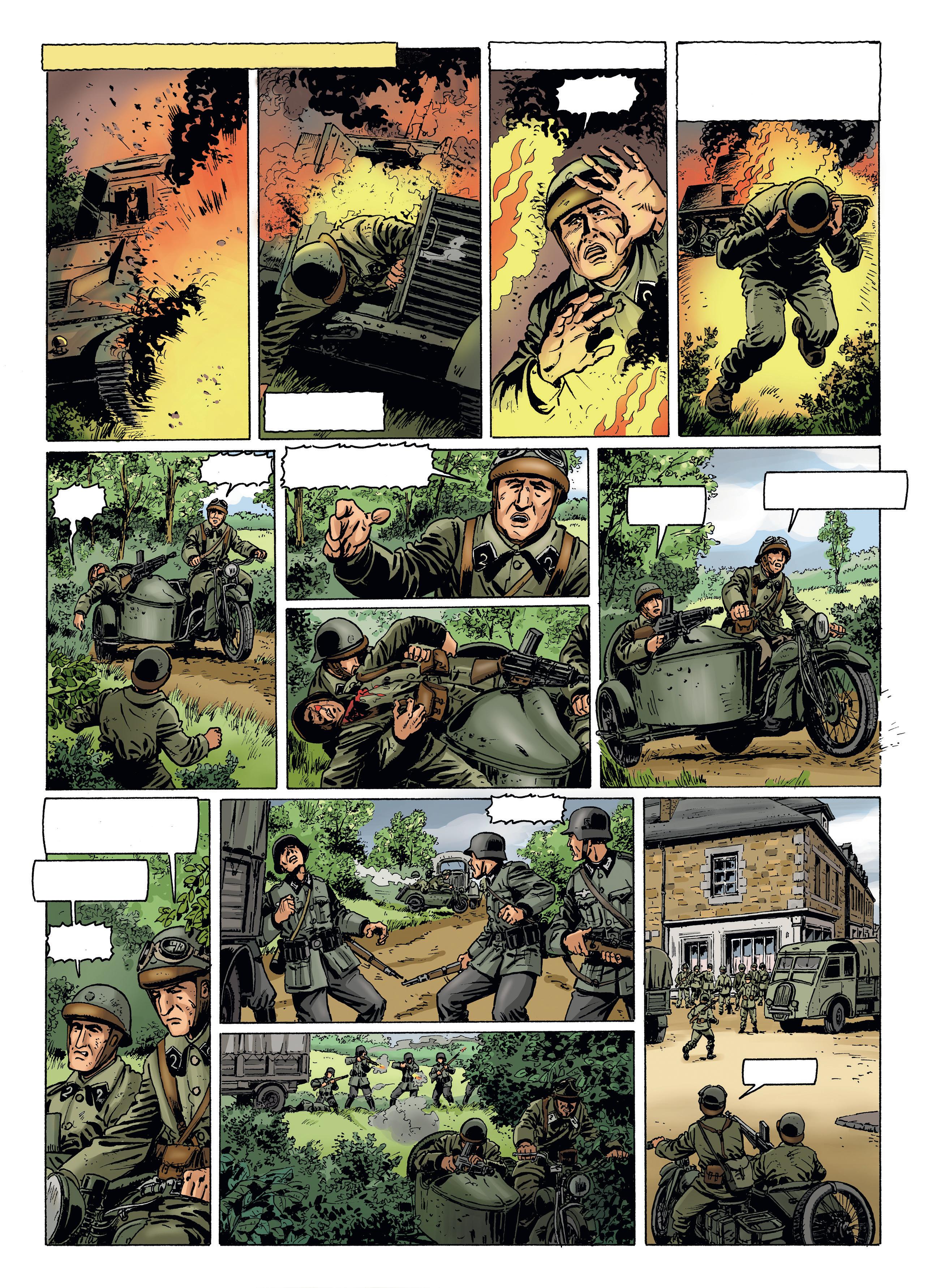 Autant pour échapper aux balles allemandes qu’aux hurlements de son camarade coincé dans le véhicule en flammes... Le Brigadier part en courant droit devant lui.