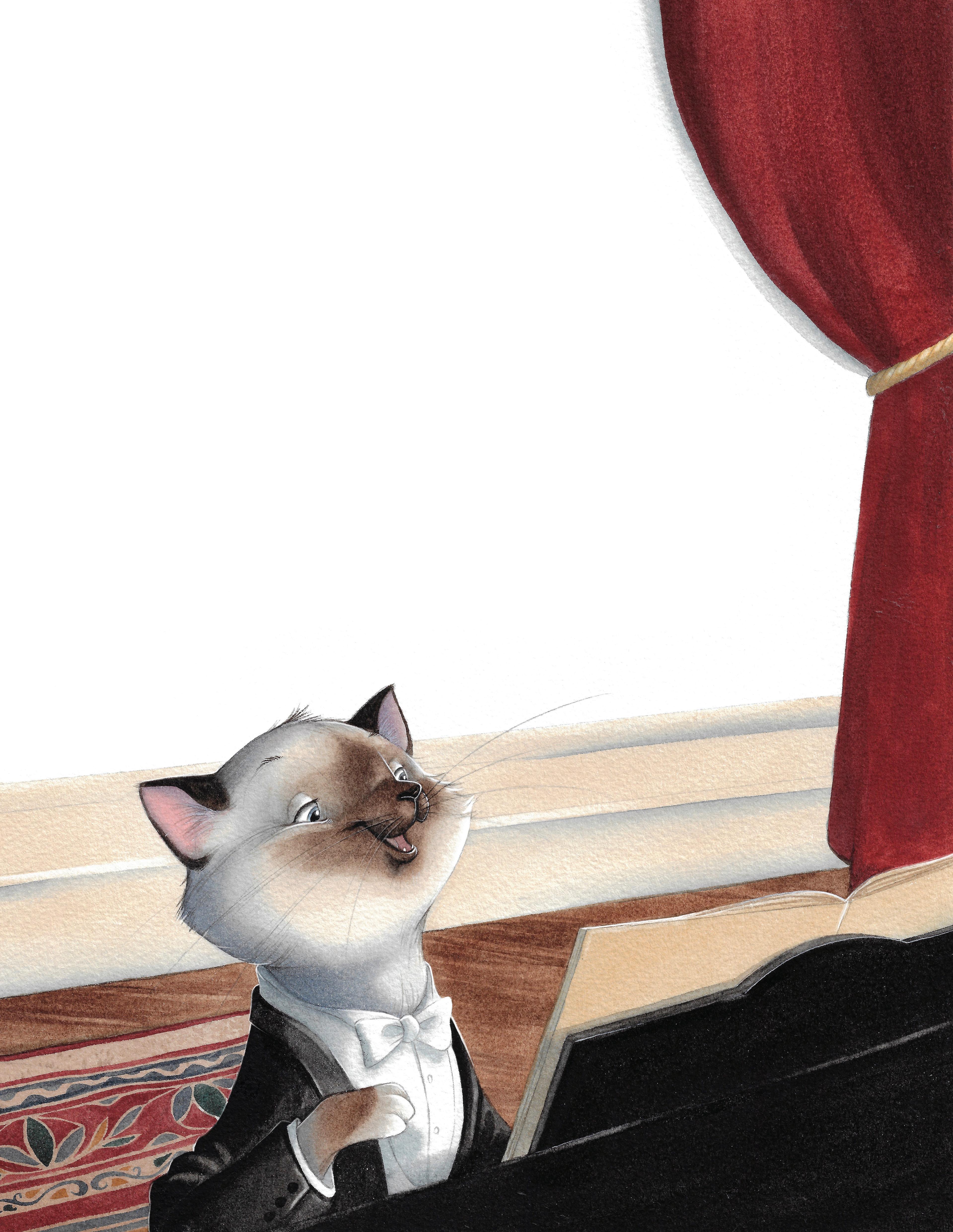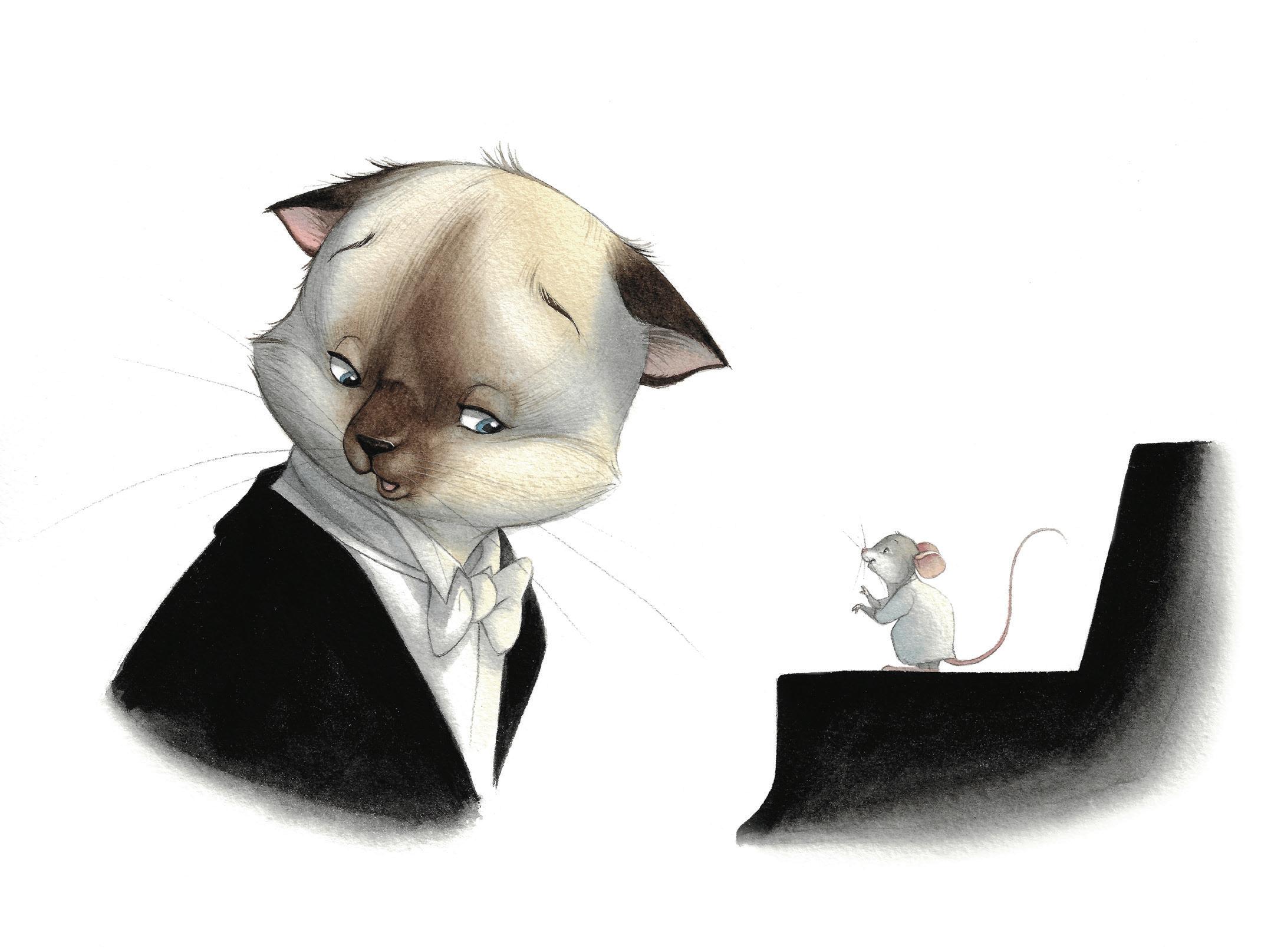 Les souris attendent, sans respirer, les yeux fermés. Notre matou de prince retire son chapeau, s’installe au piano, déplie une partition et ses griffes se promènent avec agilité sur le clavier, trouvant un joli chemin entre les touches.