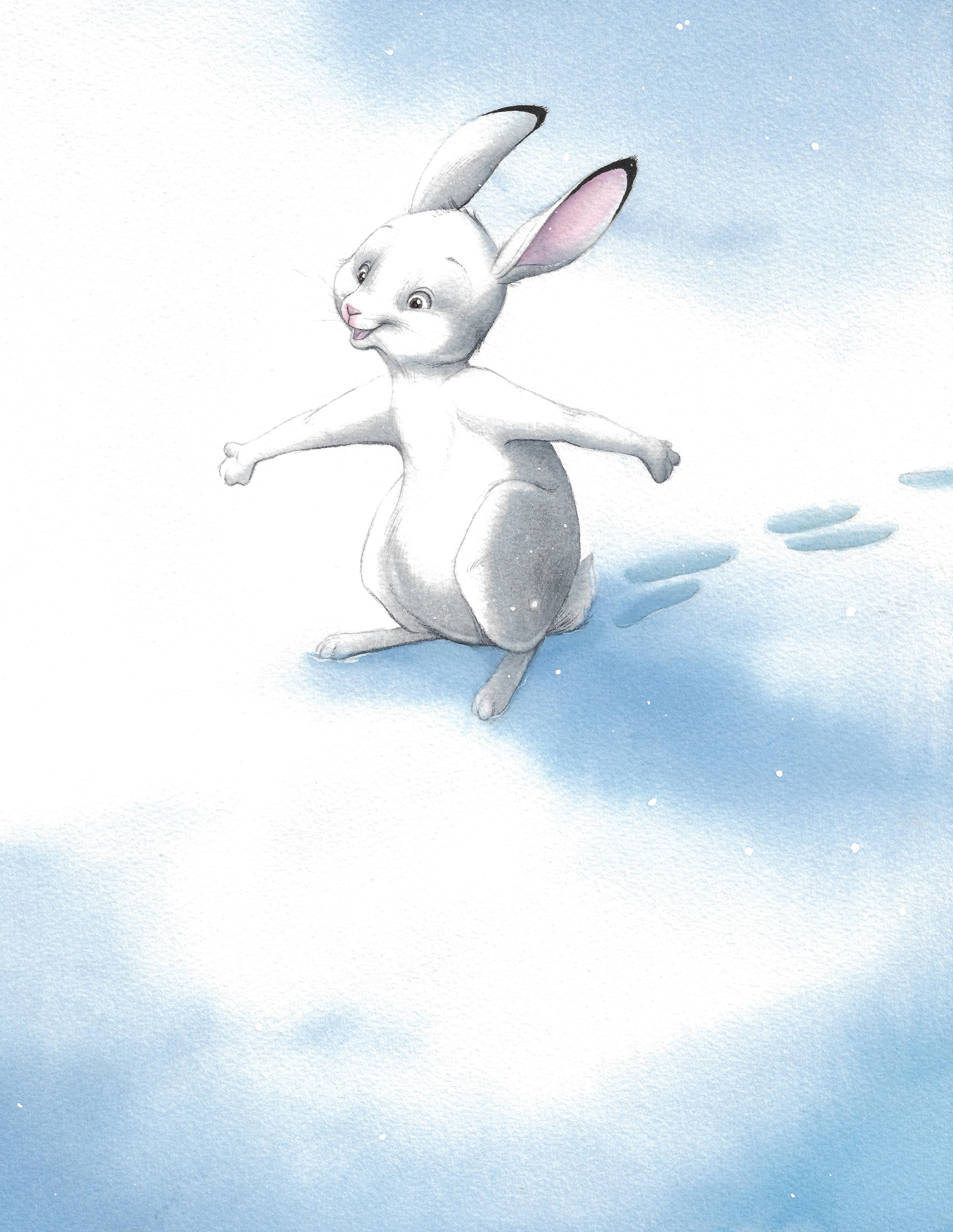 Les deux sœurs sortent du terrier et valsent au milieu des flocons. Et elles ne s’aperçoivent pas que quelqu’un est arrivé…