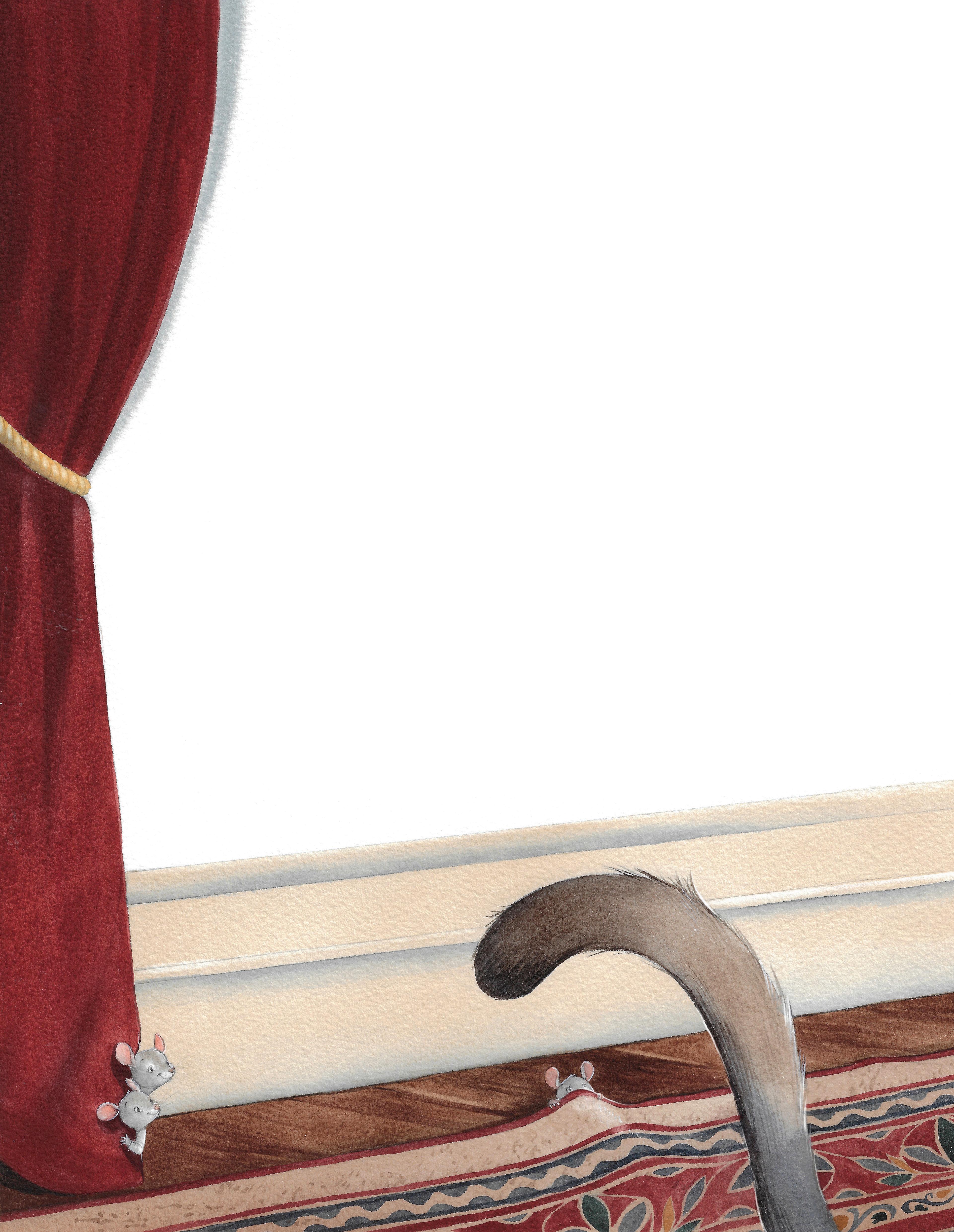 Soudain, une porte grince. Ni une ni deux, les petites souris courent se cacher. Quelle frayeur ! La porte s’ouvre alors juste assez pour laisser passer un chat très sérieux, un chat avec une très, très longue queue. Il avance à pas de velours, dans son costume de scène, queue-de-pie, nœud papillon et haut-de-forme. On dirait un prince ! Les petites souris sont toutes tremblantes. Les unes derrière les gros rideaux de velours rouge, les autres entre deux livres de la bibliothèque, une dernière sous le tapis moelleux. Comme ce chat a de grandes moustaches !