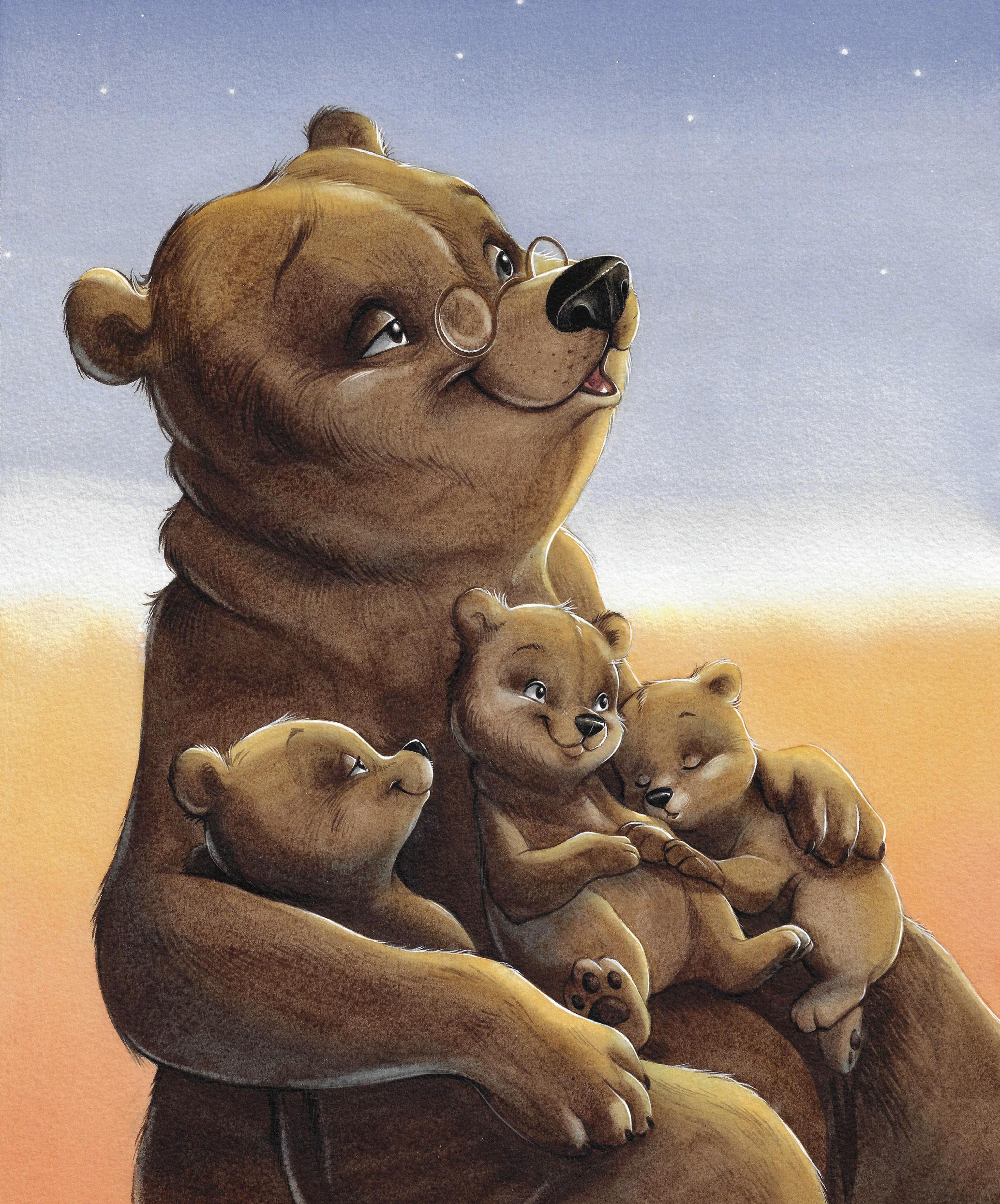 Mais, ce que les oursons préfèrent chez Grand-Papa Ours, ce sont les veillées. Chaque soir, après le dîner, le vieil ours installe une confortable couverture sur l’herbe, il invite les oursons à s’asseoir autour de lui et commence ainsi :
