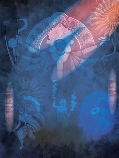 Durga est la personnification de l’énergie féminine sacrée de la protec tion et de la guérison dans la culture hindoue� Elle est d’ailleurs l’une des déesses hindoues dont l’énergie est la plus influente, composée de neuf facettes qui, toutes réunies, protègent et éliminent la souffrance dans les trois mondes� Ces trois mondes (la Triloka) sont les suivants : le ciel (svarga), la Terre (bhûmi) et l’enfer (pâtâla)�