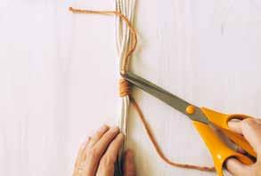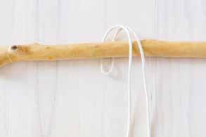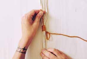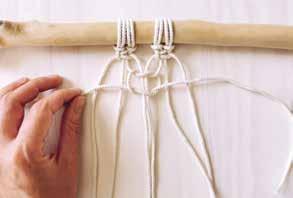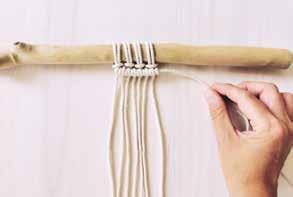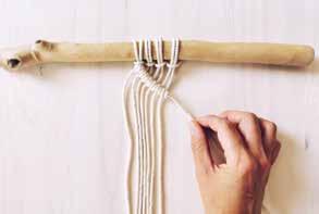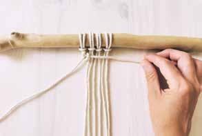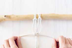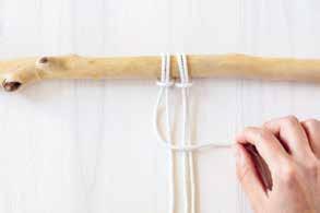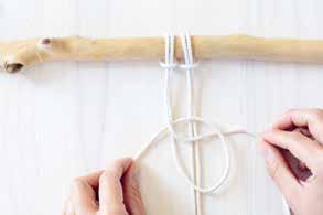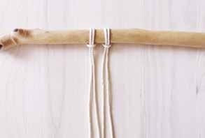 Attachez deux cordes au bois en réalisant un nœud en tête d’alouette. Prenez le premier fil sur votre gauche, placez le par-dessus les fils suivants. C’est le fil porteur.
