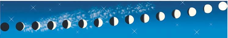 En haut, la Lune croissante débute avec la nouvelle lune, invisible dans le ciel, puis passe par le premier quartier et se termine à la pleine lune. Le croissant grossit un peu chaque jour jusqu’à former un globe. En bas, elle est décroissante de la pleine lune à la nouvelle lune en passant par le dernier quartier.