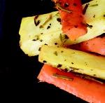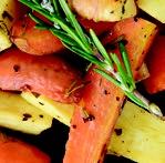 • Déposez 1 noix de beurre dans une poêle et ajoutez les quartiers de panais et de carottes, complétez de 5 brins de serpolet et de 2 rameaux de romarin. Salez et poivrez. Faites cuire à feu très doux à couvert pendant 30 minutes en ajoutant de temps en temps un peu d’eau pour éviter aux panais et aux carottes d’attacher.