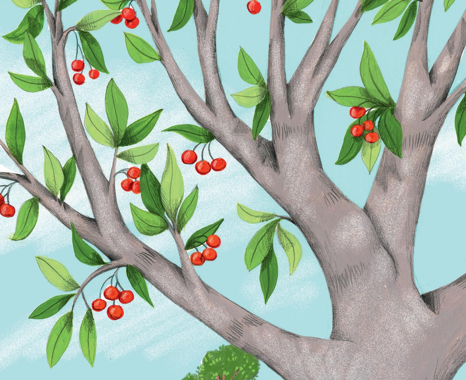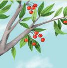Lève la tête ! Tu pourrais faire des rencontres… comme ce petit écureuil qui saute de branche en branche : il cherche sa nourriture, et cela tombe bien, il adore les cerises ! À l'automne, il enterre glands, noix et noisettes pour avoir des réserves l'hiver.