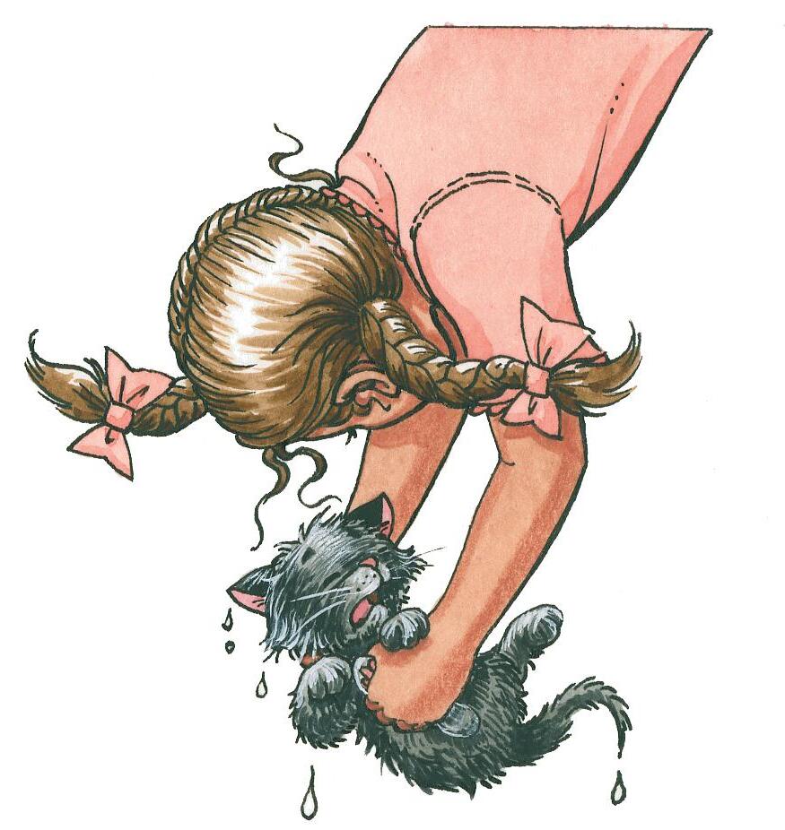 Délicatement, les enfants emmaillotent le petit chat et frottent doucement les poils soyeux.