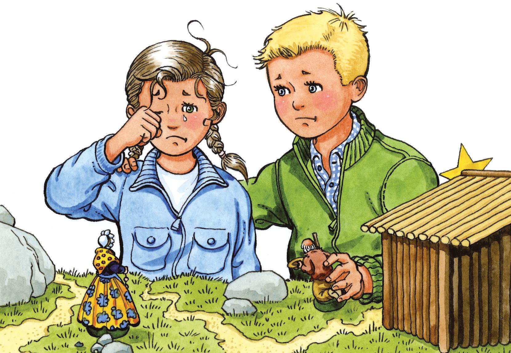Paul saisit le personnage pendant que sa cousine tortille une de ses nattes avec un doigt.