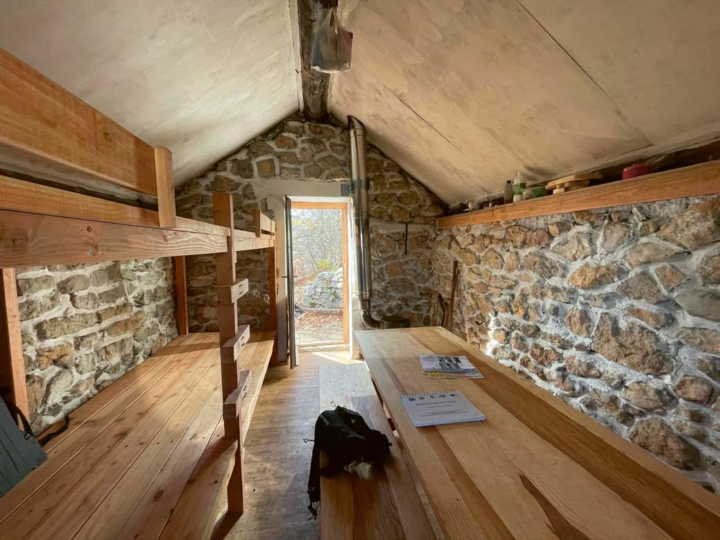 Un abri à l’est de la Sierre, sur les plateaux des Ramées, qui dispose, en dehors d’une table et de bancs, d’une cheminée et de quelques ustensiles.