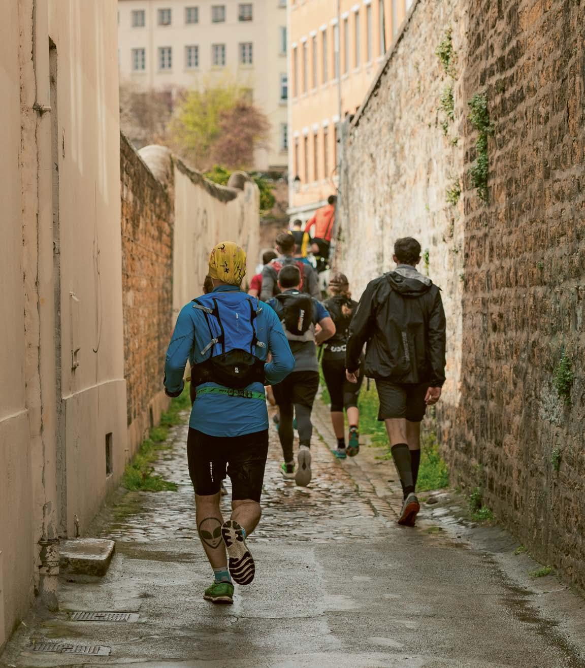 Avec quatre parcours « courus » et une randonnée, tous les niveaux sont les bienvenus et même les non-sportifs peuvent participer 8, 14, 25 et 37 km avec 1 300 m de D+ pour ce dernier . Le principe est le même pour tous : découvrir la ville de façon décalée . Avant de s’inscrire, l’organisation modifie parfois le parcours au gré des autorisations, des fermetures ou tout simplement pour donner un peu de piment et motiver les coureurs à revenir courir chez eux ! Mais parmi les spots incontournables du 37 km, on trouve la basilique Notre-Dame de Fourvière, le théâtre romain de Lugdunum, la cathédrale SaintJean, l’opéra, les forts de Saint-Jean, de Vaise et de Montessuy… Pour le côté verdure, un petit passage par le superbe jardin de la Roseraie et par le parc de la Cerisaie . L’arrivée se fait pour toutes les courses, place de l’Hôtel de Ville Il ne reste plus qu’à fêter tout ça avec une petite virée dans un bouchon lyonnais !