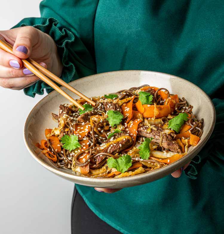 Les nouilles soba sont riches en magnésium et sans gluten. Le chou chinois et les carottes soutiennent la détox des œstrogènes. Le gingembre favorise la digestion. Le bœuf est une excellente source de fer. Idéal en période menstruelle.