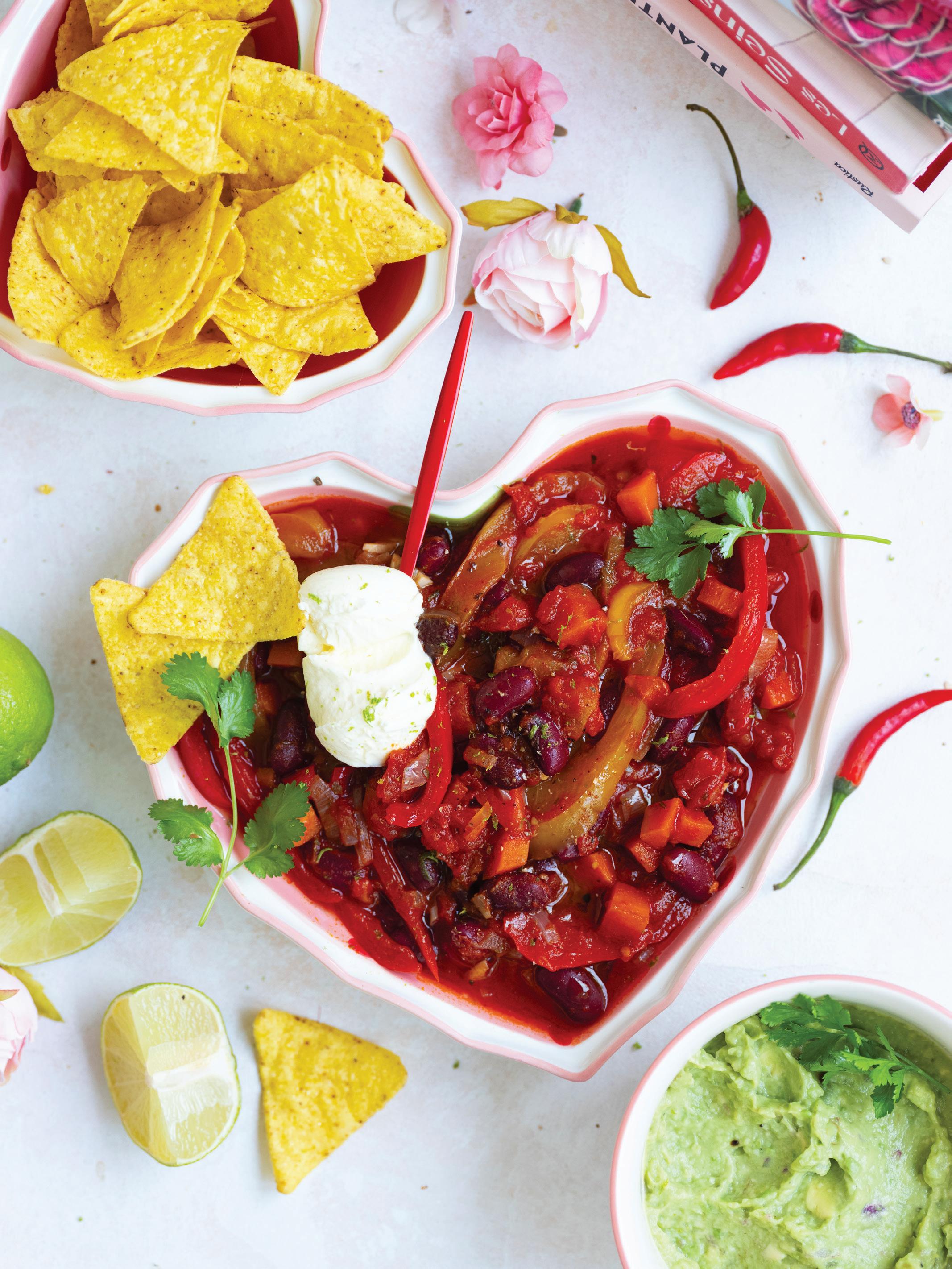 One pot chili sin carne avec guacamole et crème fraîche citronnée