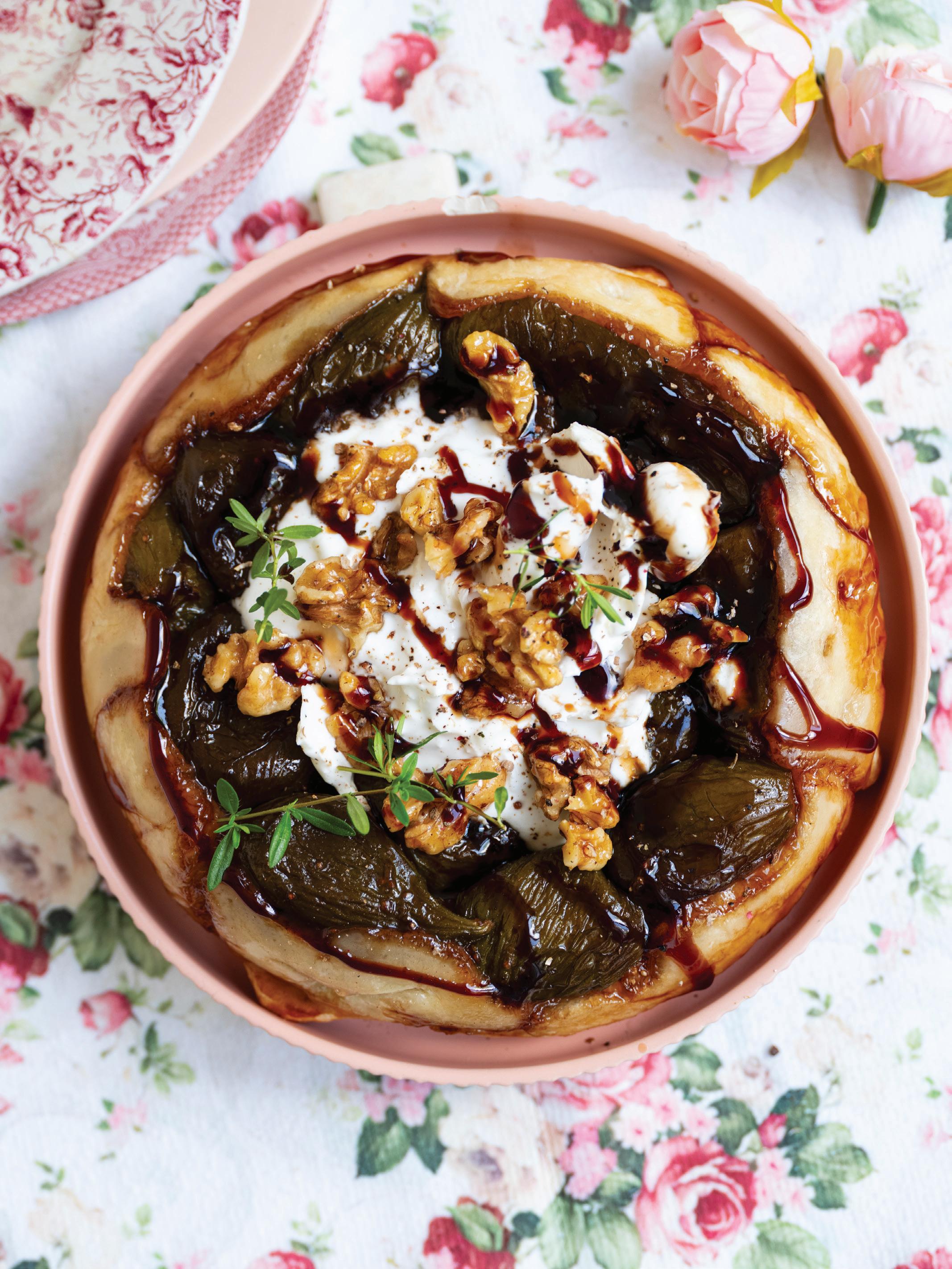 Tarte tatin figue, burrata, noix caramélisées et caramel balsamique