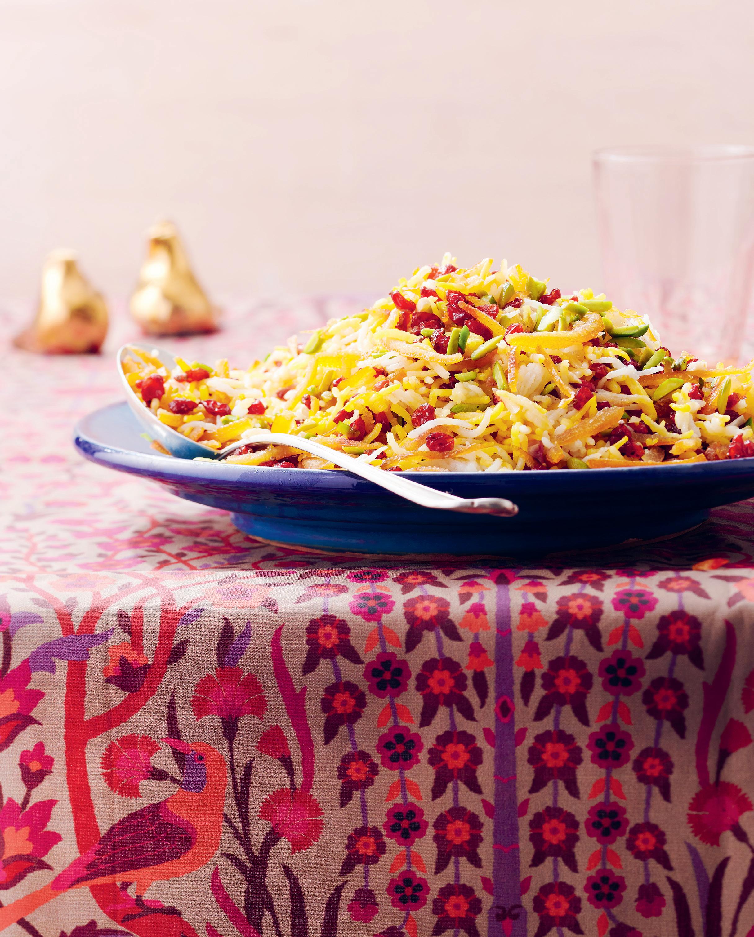 Disposez le riz blanc dans un grand plat de service en dôme, décorez avec le riz safrané, les oranges confites, les pistaches, les carottes et les amandes en bâtonnets. Réalisez une alternance de couleurs pour un effet « bijou » garanti. Servez éventuellement accompagné de poulet rôti, ou de gigot d’agneau.