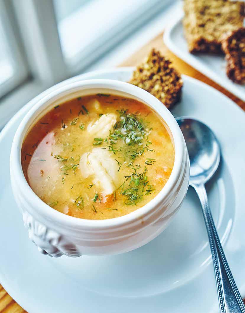 Servez chaud, garni de croûtons et d’herbes fraîches .