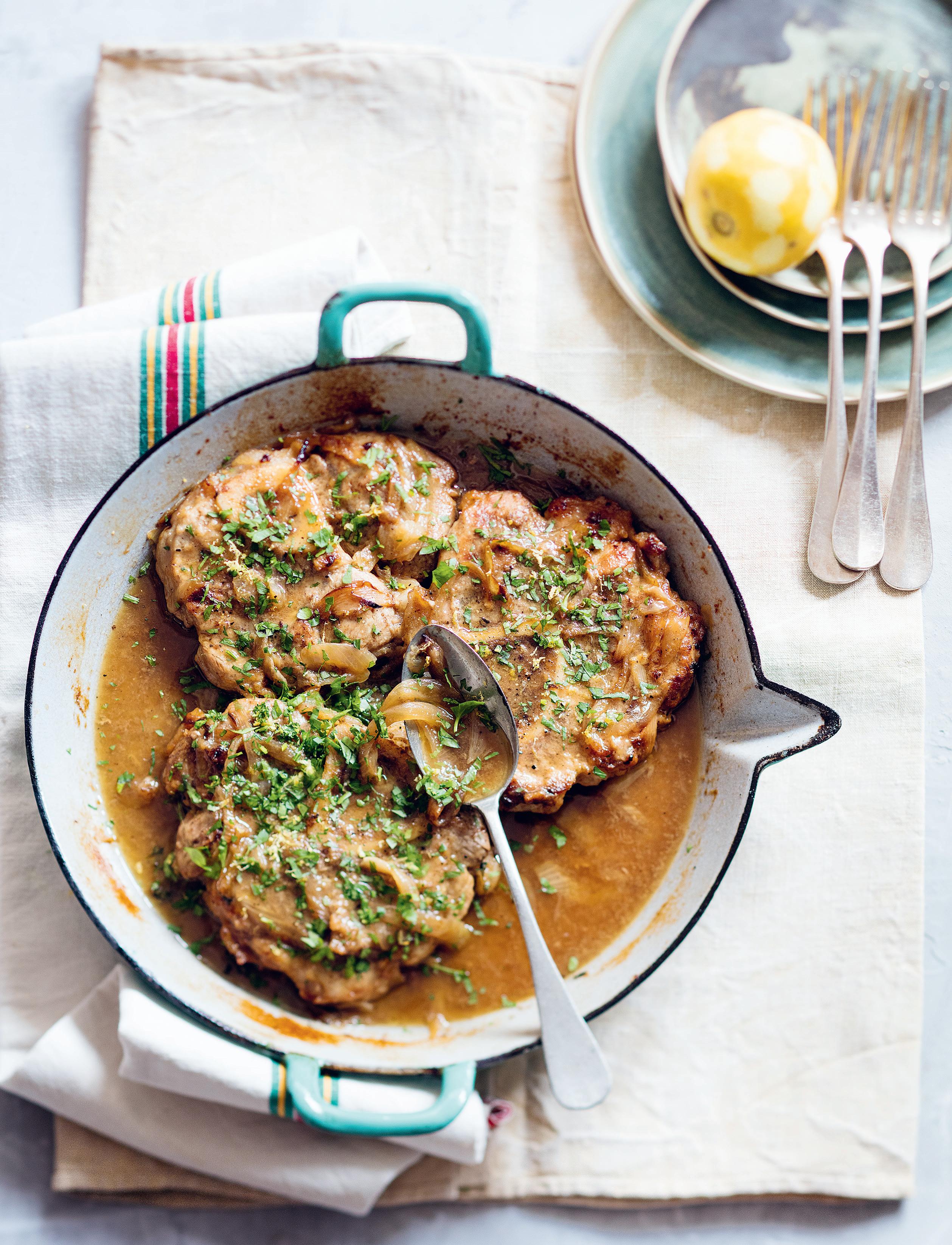 Versez dans la poêle 2 cuillerées à soupe d’huile et une noix du beurre, et faites dorer la viande de chaque côté. Ajoutez les oignons. Mouillez avec le vin blanc, laissez évaporer, salez, poivrez et ajoutez 1/2 verre de bouillon.