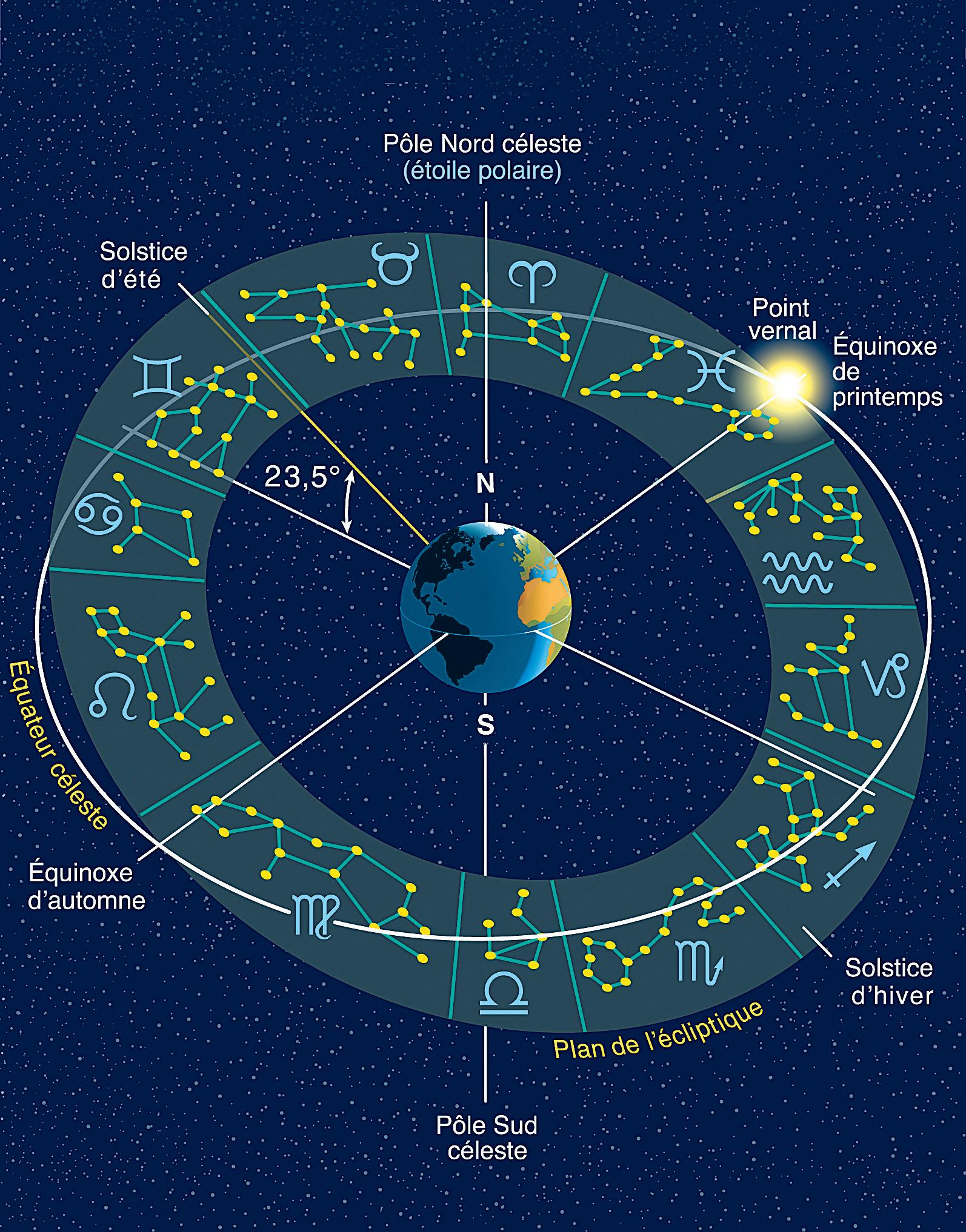 Entre le 20 et le 22 mars, selon les années, le Soleil franchit l’équateur céleste au point vernal (début du printemps et degré zéro du premier signe du zodiaque, le Bélier). Ce point très précis ne reste pas immobile par rapport aux constellations. Il recule tous les ans de 50 secondes d’arc sur l’écliptique, soit 1° en 72 ans ou un signe de 30° en 2 160 ans. Il est actuellement dans la constellation des Poissons.