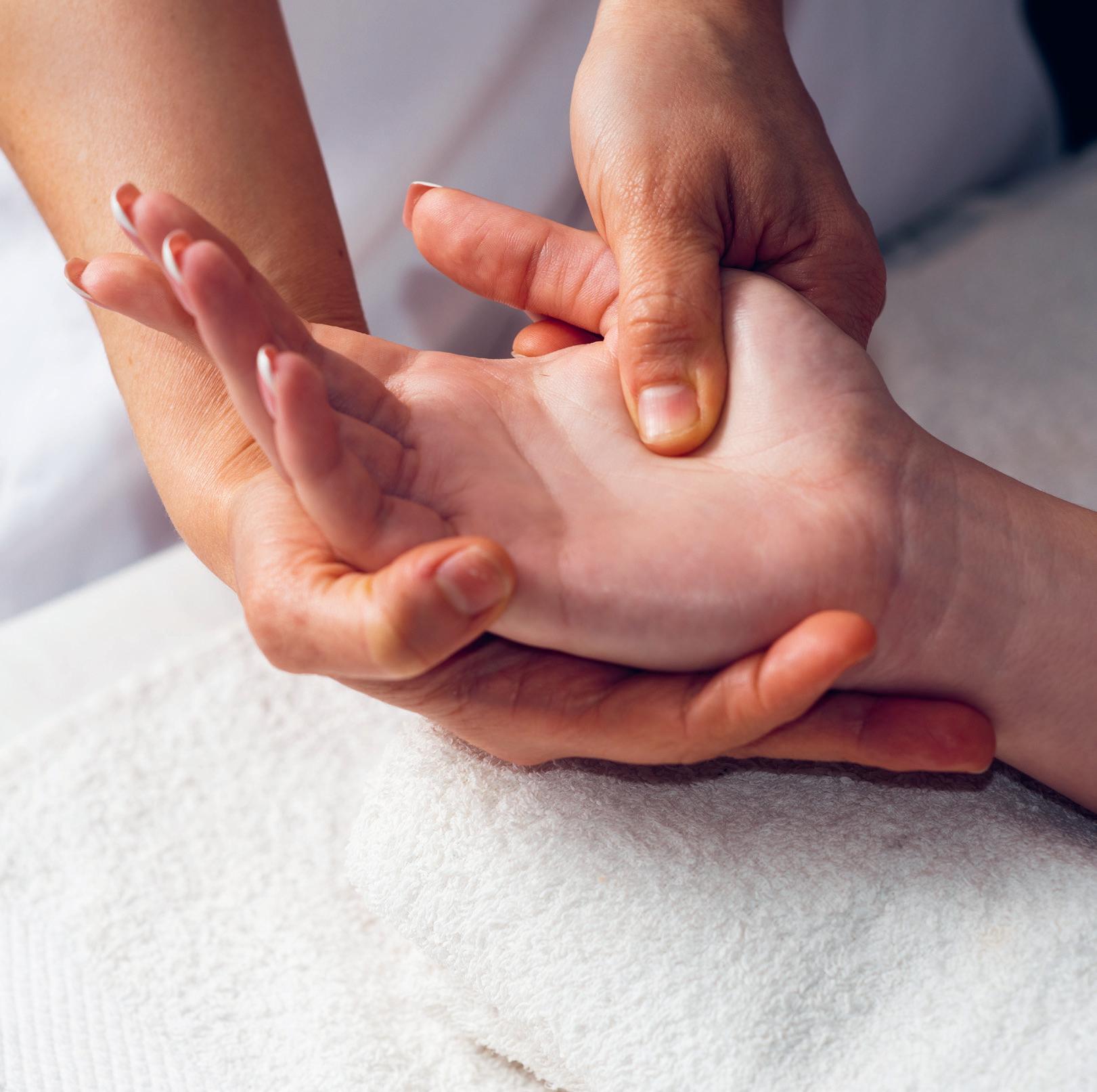 Pendant une minute et avec vos deux mains, massez fermement le dos de la main droite en descendant de la base des doigts jusqu’aux poignets . Faites la même chose avec la paume de la main en partant du poignet jusqu’aux doigts . Ensuite, avec votre pouce, effectuez trois pressions (comme si vous appuyiez sur un bouton) sur le point du plexus solaire en synchronisant votre mouvement avec la respiration du receveur . Couvrez avec une serviette la main gauche (qui est à votre droite, car vous êtes face au receveur) pour qu’il n’y ait pas de perte de chaleur pendant que vous vous occupez de sa main droite