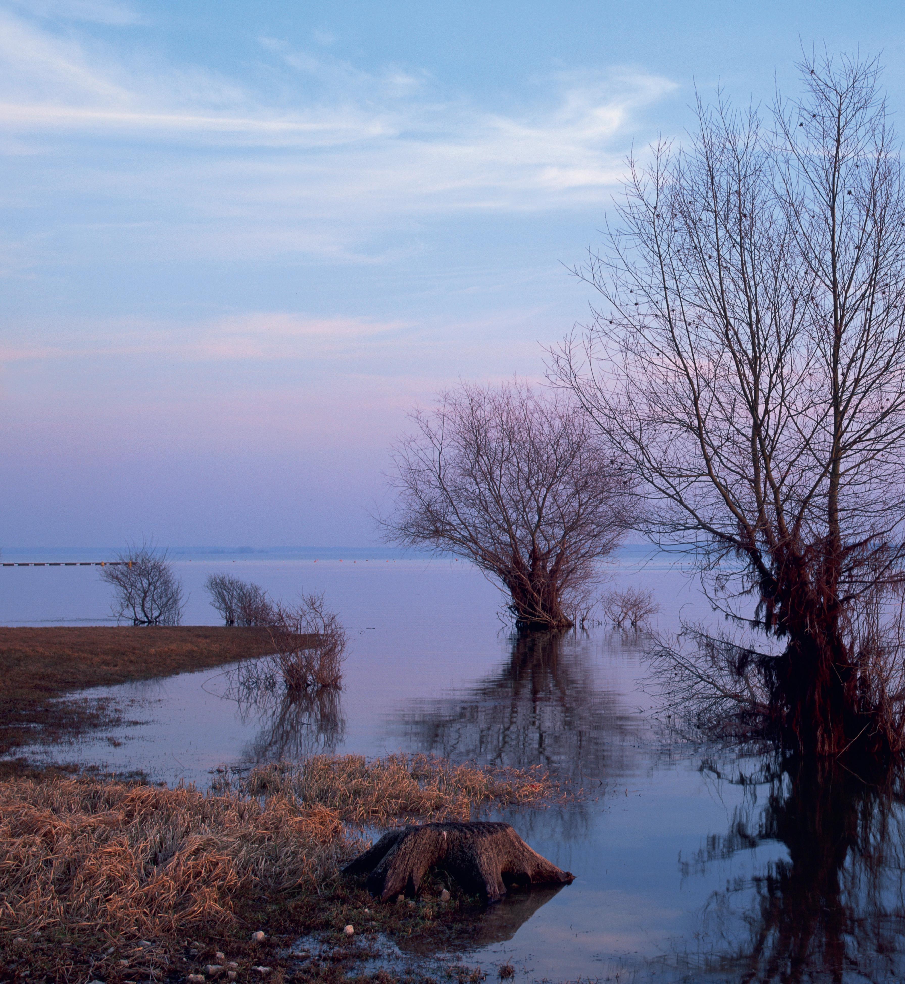 ci - contre : le soir, à la fraîcheur hivernale, les saules qui bordent le lac du Der-Chantecoq.