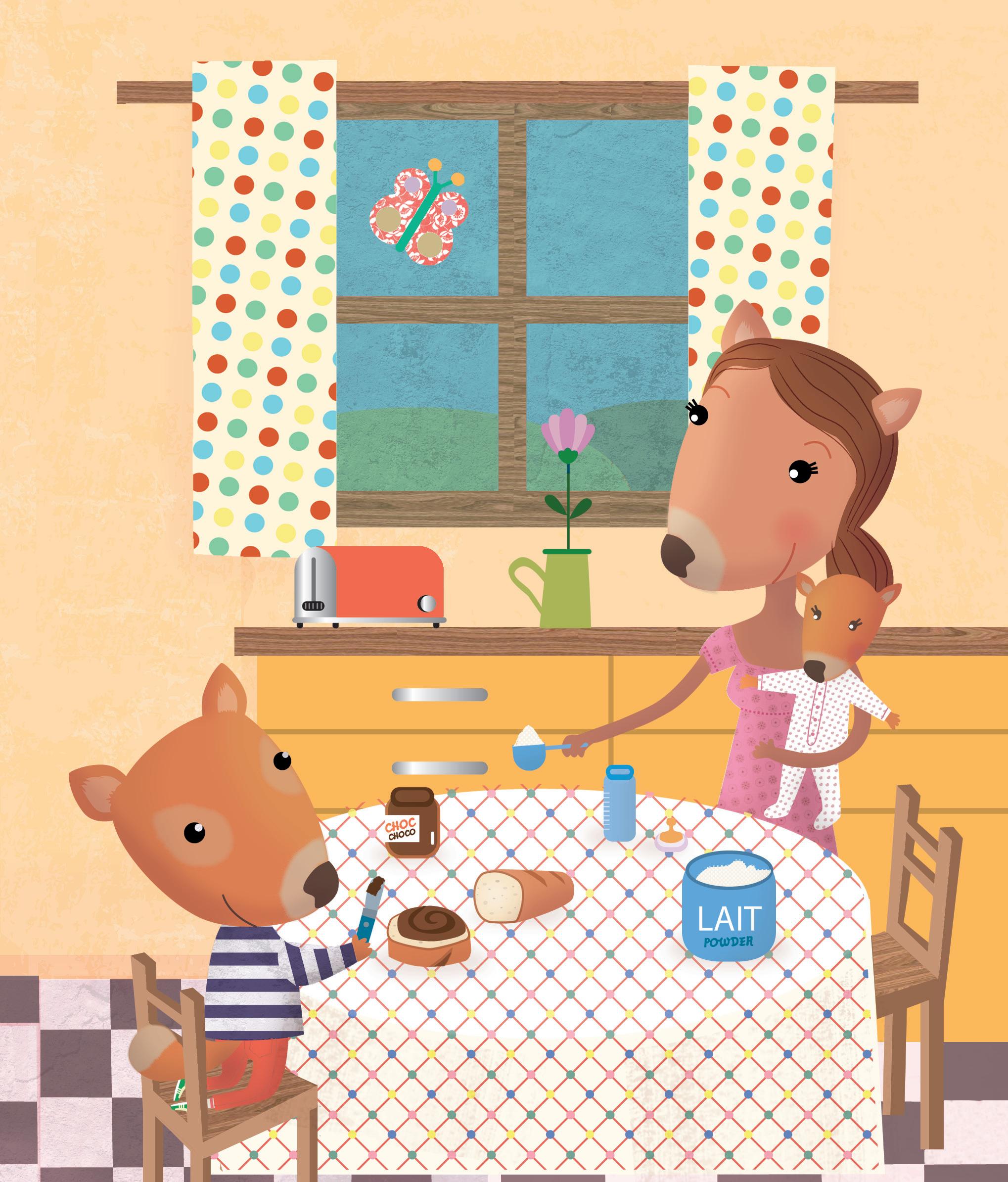À l’heure du repas, Cabotin a préparé pour sa petite sœur une tartine avec du chocolat.