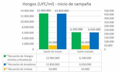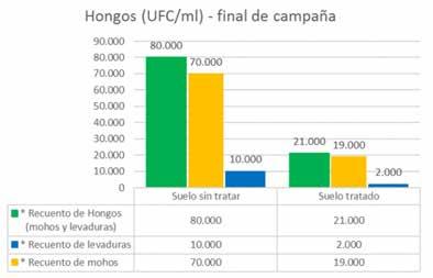 Tal y como indica en el ensayo, los resultados han sido excepcionales comparando la zona tratada respecto a la zona no tratada al inicio de la campaña y al finalizar el ciclo de cultivo, reduciendo la carga microbiológica y obte-