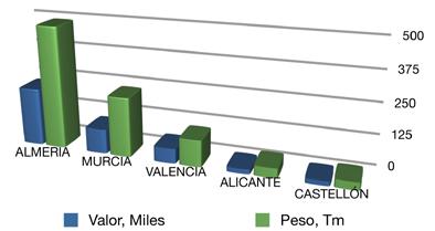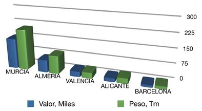 Alicante. En total se exportaron 430.000 toneladas por un valor de 455 millones de euros, prin cipalmente a Alemania, Francia, Polonia, Italia, Reino Unido y Países Bajos.
