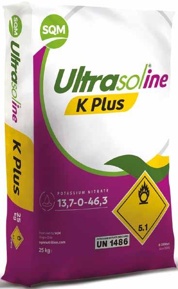 Ultrasol®ine K Plus de SQM contiene dos macronutrientes esenciales para las plantas, pota sio y nitrógeno nítrico, además de yodo procedente de recursos natu rales. Como el potasio y el nitró geno nítrico se aplican en propor ciones bien definidas, Ultrasol® K Plus garantiza también la admi nistración de una dosis de yodo adecuada. Esto facilita al produc tor mantener una concentración
