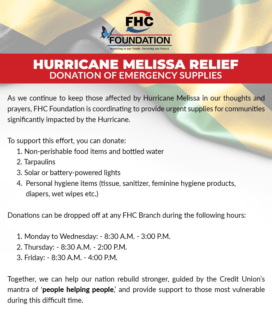 First Heritage Co-operative Credit Union Limited (FHC) has announced a threemonth loan payment moratorium for members directly impacted by Hurricane Melissa, reinforcing its longstanding commitment to the credit union philosophy of “People Helping People.”