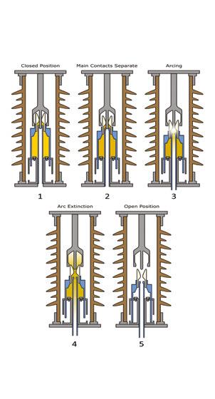 Während des Normalbetriebs ist der Schalter geschlossen und der Strom fliesst über den Hauptkontakt (1). Im Fehlerfall wird der Stromfluss auf die Lichtbogenkontakte umgeleitet, die kurz darauf geöffnet werden (2), woraufhin sich ein Lichtbogen zwischen diesen Kontakten bildet (3). Dieser Lichtbogen besteht aus einer heissen und leitfähigen Plasmasäule. Ein Löschen des Lichtbogens ist lediglich im Nulldurchgang des Stromes realisierbar, da zu diesem Zeitpunkt die Energie am geringsten ist. Zusätzlich wird der Lichtbogen durch intensive Gasströme entlang des Lichtbogens gekühlt und somit zusätzlich Energie entzogen, (4). Hierbei wird so viel Energie entzogen, dass ein entionisiertes Gebiet mit hoher dielektrischer Festigkeit zwischen den Schaltkontakten entsteht, sodass nach dem Löschen des Lichtbogens im Stromnulldurchgang keine Neuzündung durch die anliegende Spannung stattfindet. Ist dies der Fall, so ist der Schalter geöffnet und der Kontakt unterbrochen (5).