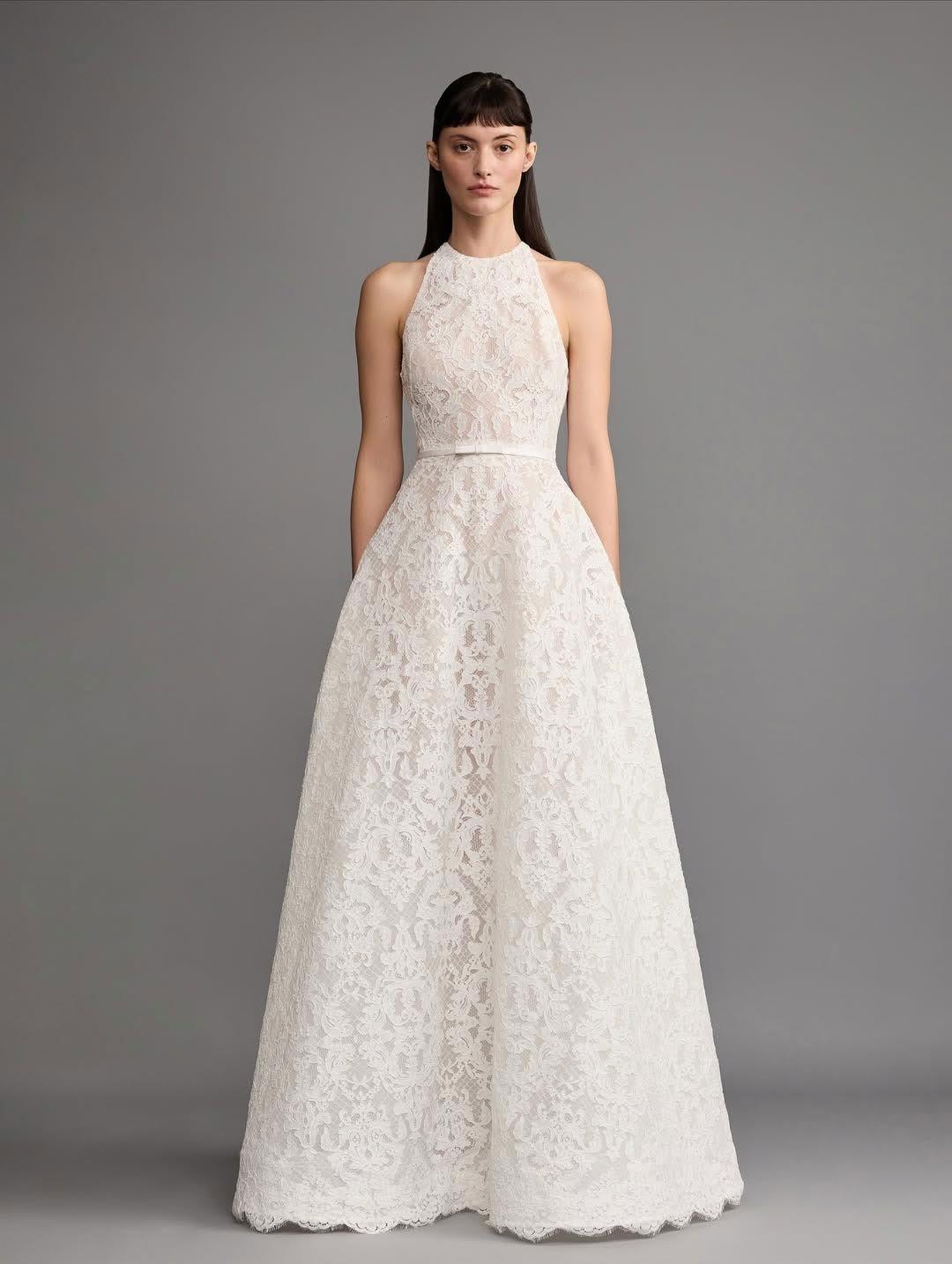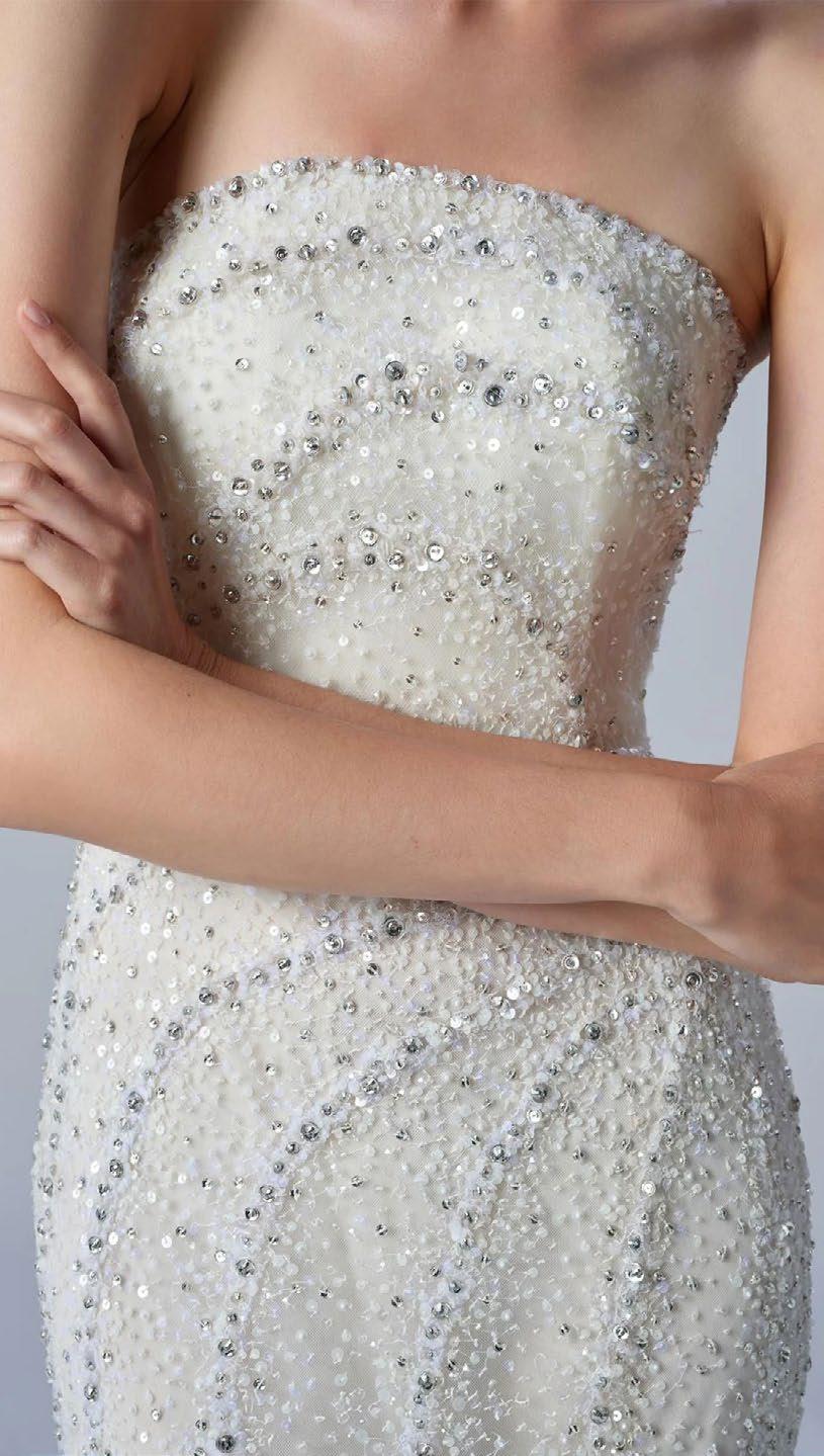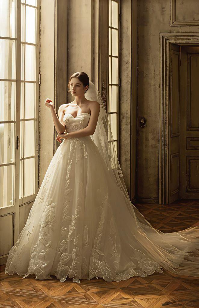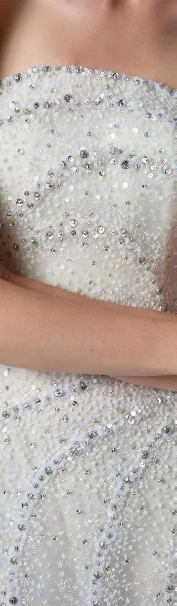 El 2026 apuesta por la textura tridimensional. las flores en 3D aplicadas en hombros y faldas, así como los bordados personalizados (fechas o iniciales ocultas), son esenciales para las novias que buscan autenticidad. Otra tendencia fuerte es el brillo plateado y la pedrería metálica, que desplazan ligeramente al oro tradicional. Además, la estética “Old Money” trae de vuelta los encajes completos, pero con patrones botánicos modernos, y el uso extensivo de perlas, no solo en joyería, sino incrustadas directamente en corsés y telas.