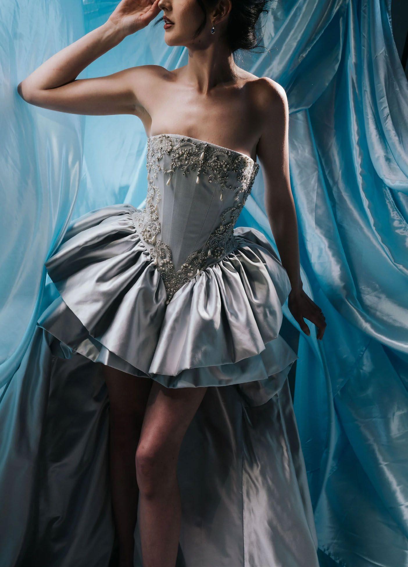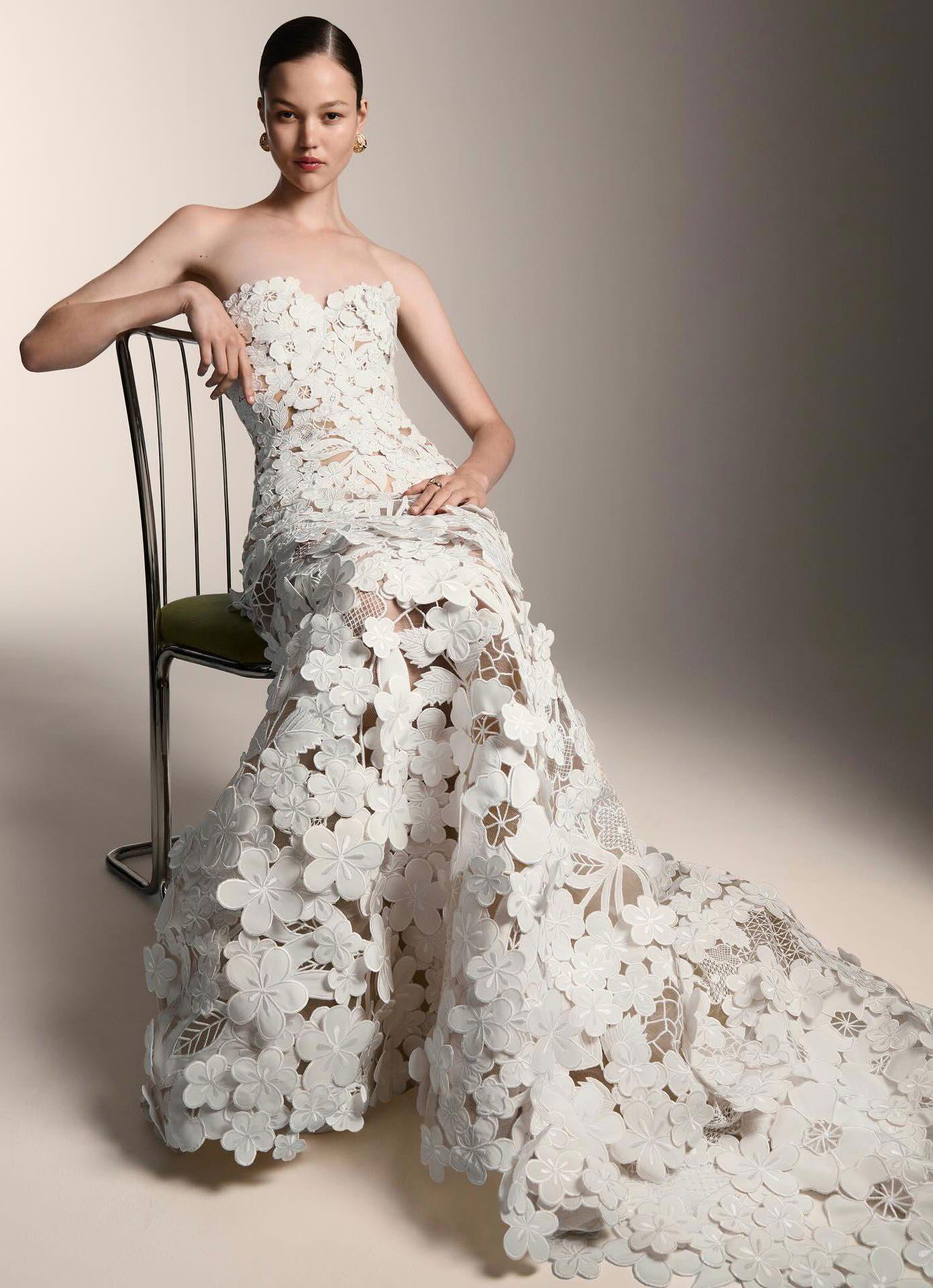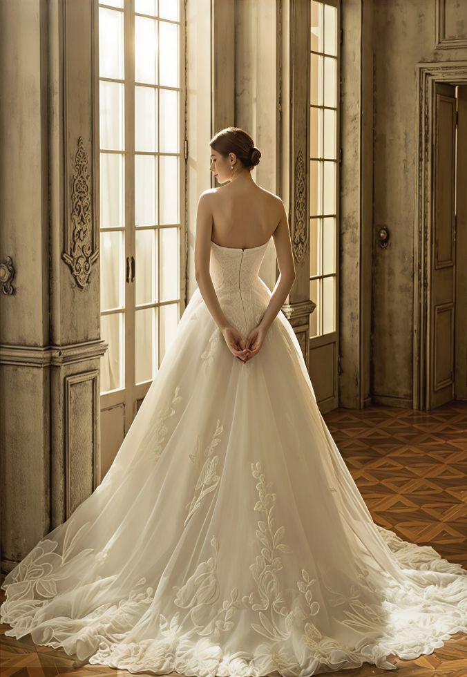 El 2026 apuesta por la textura tridimensional. las flores en 3D aplicadas en hombros y faldas, así como los bordados personalizados (fechas o iniciales ocultas), son esenciales para las novias que buscan autenticidad. Otra tendencia fuerte es el brillo plateado y la pedrería metálica, que desplazan ligeramente al oro tradicional. Además, la estética “Old Money” trae de vuelta los encajes completos, pero con patrones botánicos modernos, y el uso extensivo de perlas, no solo en joyería, sino incrustadas directamente en corsés y telas.