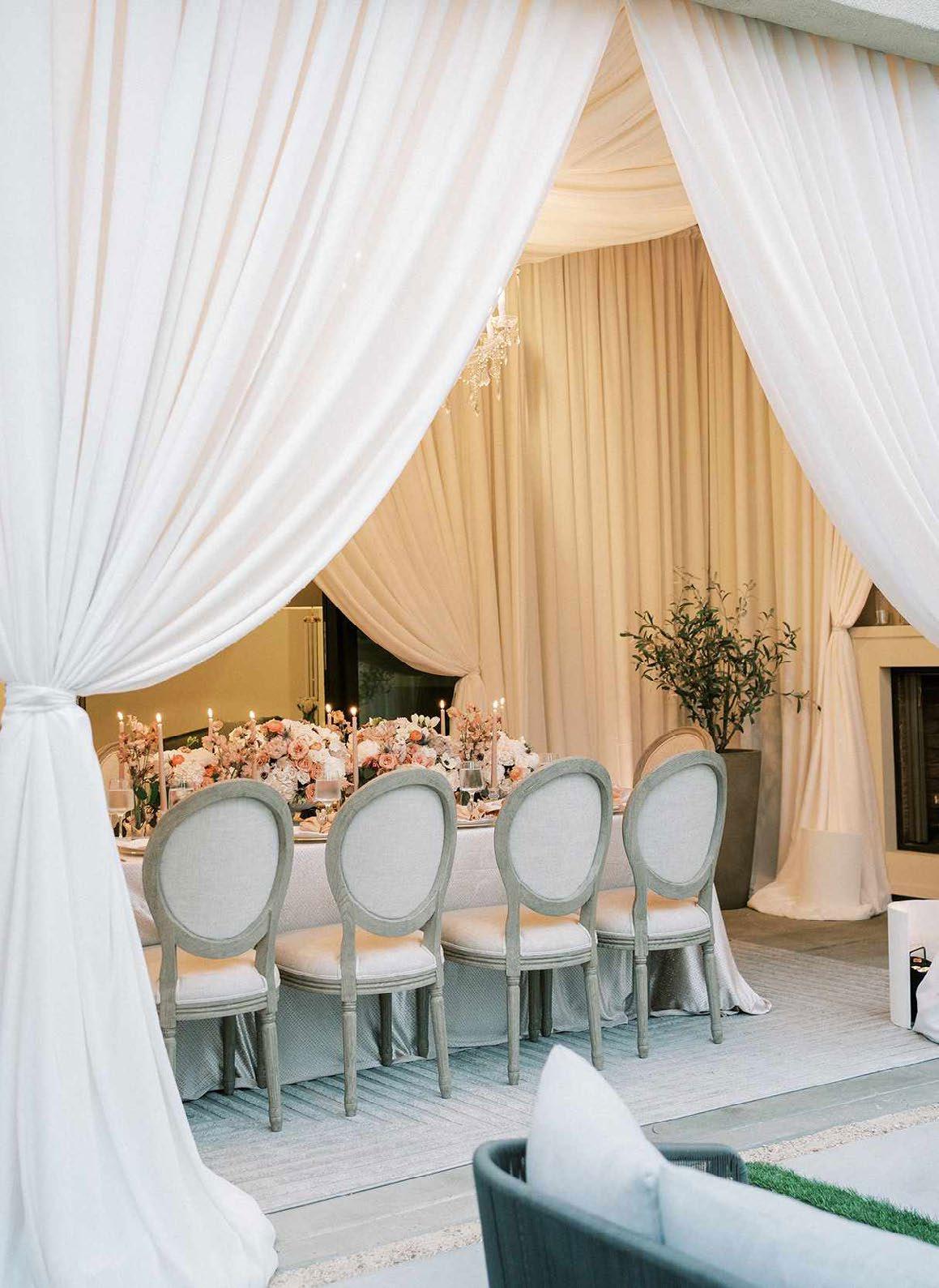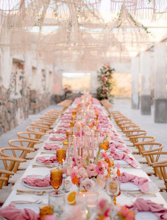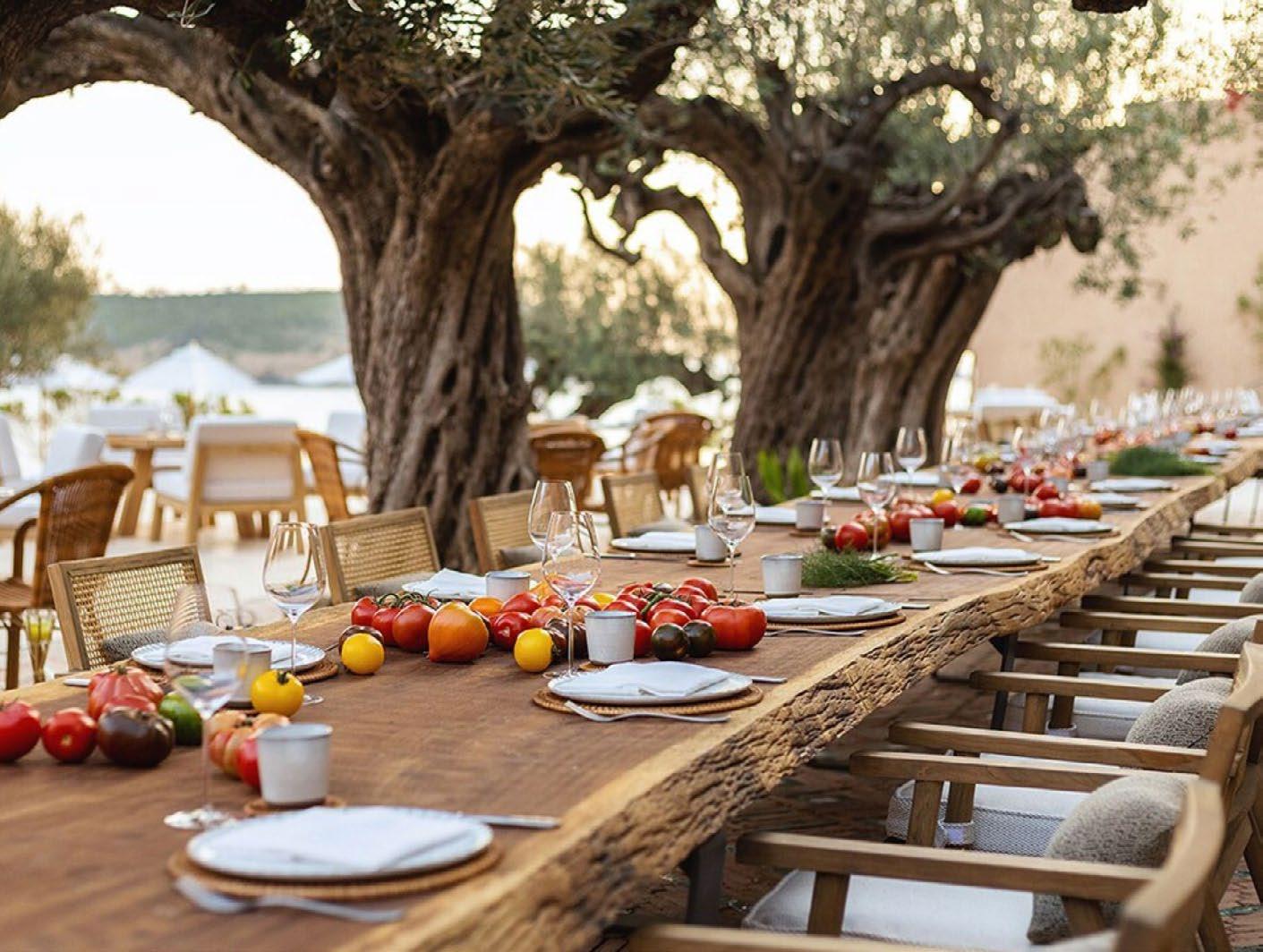 El estilo mediterráneo chic será el gran protagonista, utilizando materiales táctiles y naturales. Veremos mesas con manteles de lino crudo, vajillas de cerámica artesanal y detalles en platería antigua que aportan un aire noble. las estructuras serán fluidas, con techos vestidos de gasas y tules que crean atmósferas envolventes. Además, se imponen las texturas orgánicas como el mimbre y la madera con veta visible, buscando una elegancia que se pueda “sentir” al tacto y no solo ver.