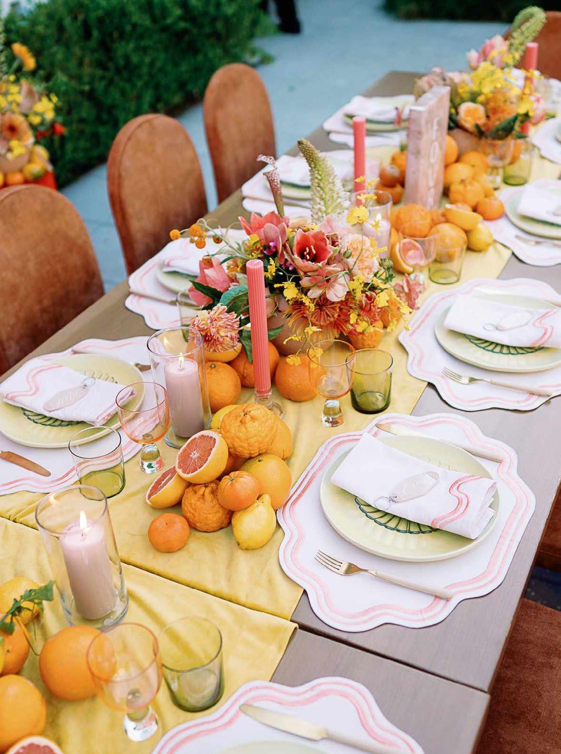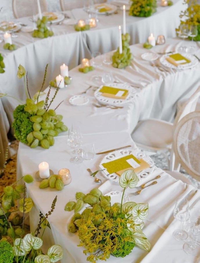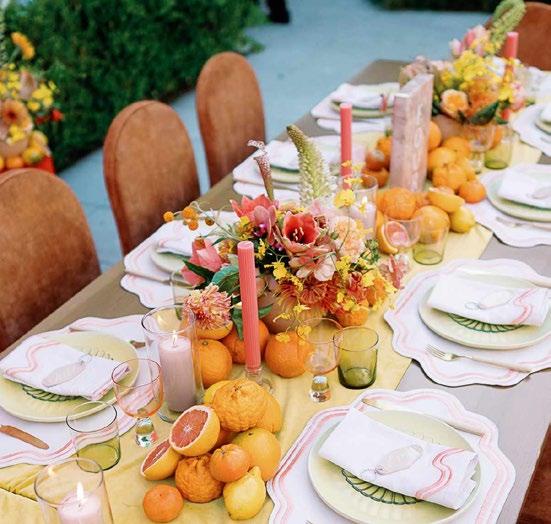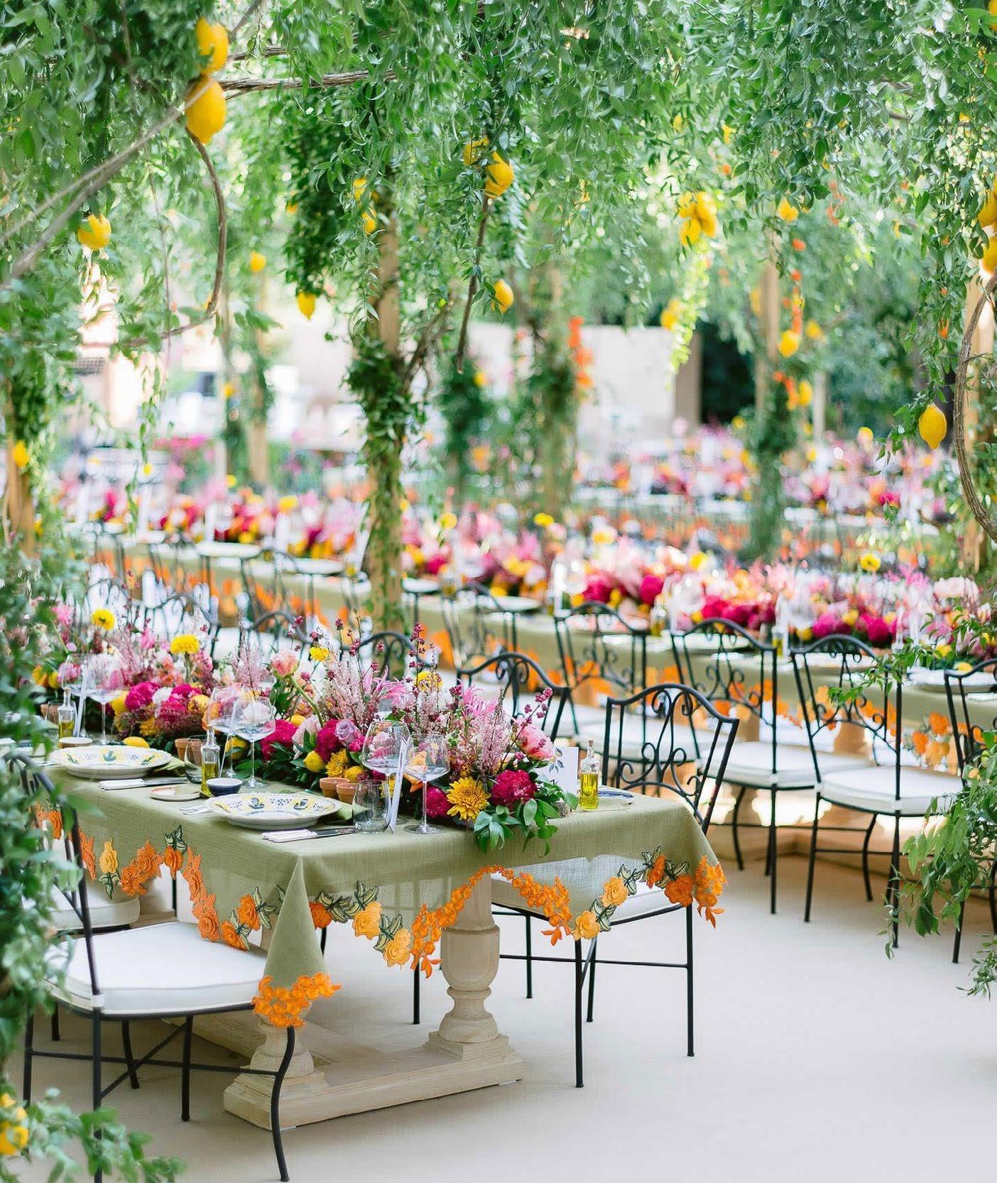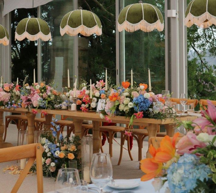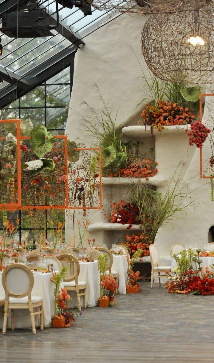 la decoración floral evoluciona hacia composiciones artísticas que incluyen frutas (como cítricos e higos) y ramas escultóricas, creando escenas poéticas en lugar de ramos tradicionales. los “prados florales” a ras de suelo y las nubes suspendidas ganan terreno para no obstruir las vistas. En cuanto a la iluminación, las velas cobran un rol principal en cascadas o estructuras aéreas, acompañadas de lámparas decoradas con vegetación, priorizando una luz cálida y envolvente.