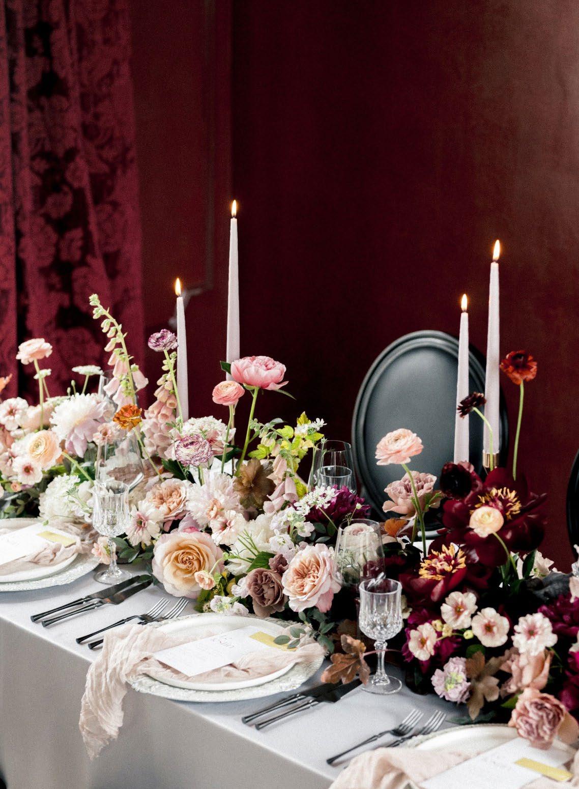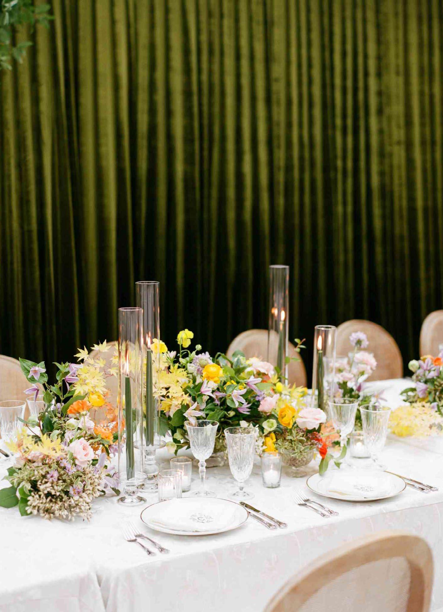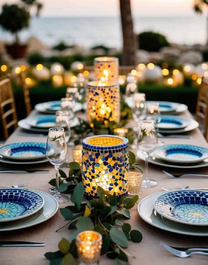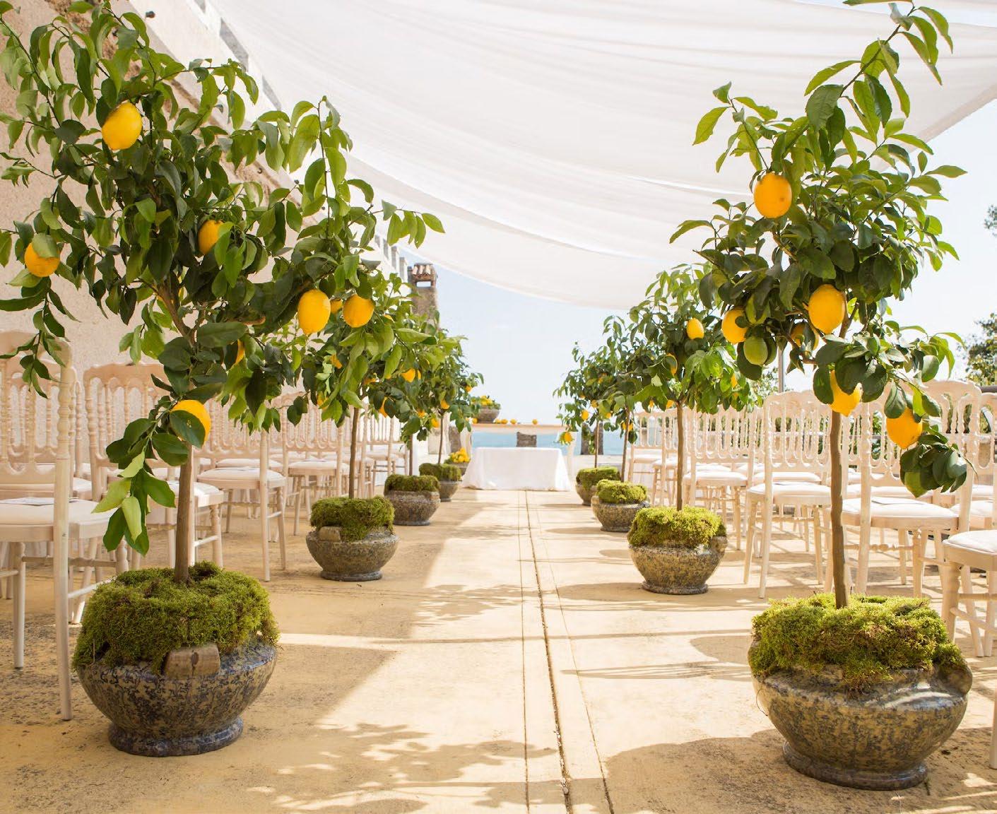 la decoración floral evoluciona hacia composiciones artísticas que incluyen frutas (como cítricos e higos) y ramas escultóricas, creando escenas poéticas en lugar de ramos tradicionales. los “prados florales” a ras de suelo y las nubes suspendidas ganan terreno para no obstruir las vistas. En cuanto a la iluminación, las velas cobran un rol principal en cascadas o estructuras aéreas, acompañadas de lámparas decoradas con vegetación, priorizando una luz cálida y envolvente.