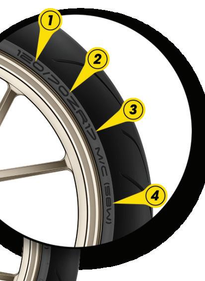 This is the area of extra-thick rubber that runs from the bead to the tread and gives your tyre its lateral stability. It’s also where you’ll find all of the manufacturer information about your tyre, but what does a number such as 120/70 ZR17 M/C (58W) actually mean? Here’s a little guide to understanding these markings: