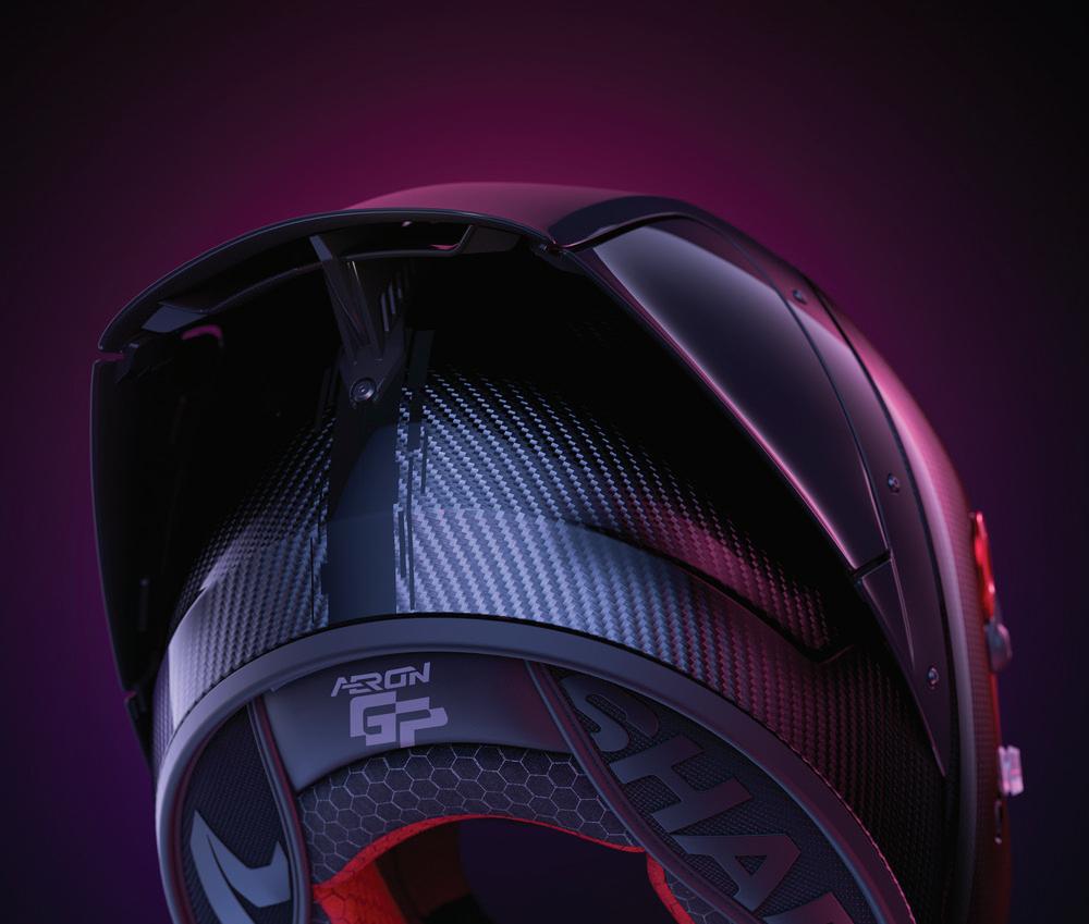 AERON GP CAN ADAPT ITS SHAPE TO THE RIDER’S POSITION, OFFERING AN UNRIVALLED LEVEL OF COMFORT AND PLEASURE ON THE TRACK. THANKS TO ITS INNOVATIVE SPOILER, EQUIPPED WITH ADAPTIVE FLAPS, THE HELMET OFFERS LESS AIR RESISTANCE, ALLOWING HIGHER SPEEDS TO BE REACHED. A2S - ADAPTIVE AERO SYSTEM REDUCES FLAGGING BY 80%, HIGHSPEED TURBULENCE BY 50%, AND AERODYNAMIC DRAG BY 5%, PUSHING BEYOND THE HIGHEST LIMITS.