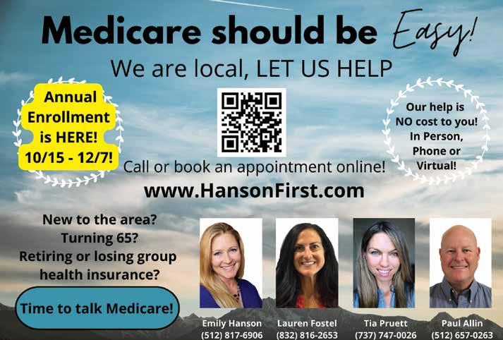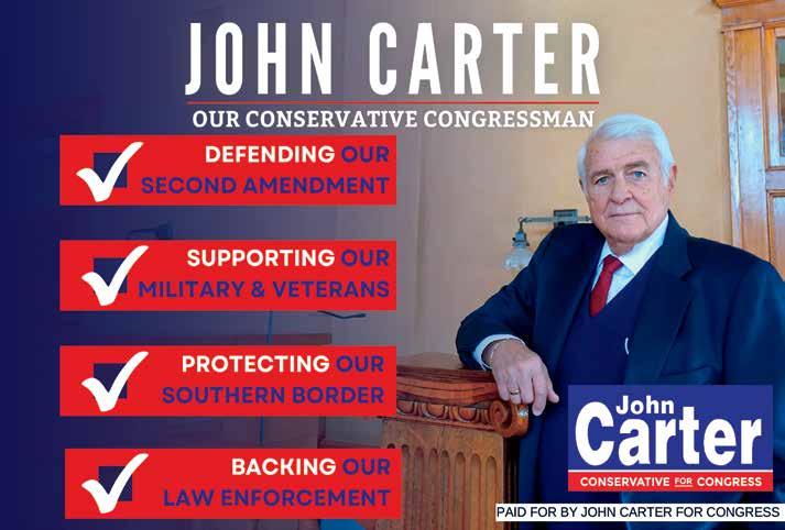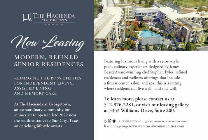 Family Owned Since 1939 512.864.7579 $500 OFF Replacement Roof Must be 20 sqrs or more. Cannot be combined with another o er. Cannot be used in insurance claims for money back. Please present coupon. Expires 10/31/22 40209 Industrial Park Circle in Georgetown www.hallsroo ng.net hallsroo ng@gmail.com 512.864.7579 We are the Original Halls Roo ng since 1939 Our one location is in Georgetown O ce Location: Agents You’ve Seen Our Signs LONE STAR 1003 S. Austin Ave. Georgetown 512.868.1771 Each o ce is independently owned and operated. KWLonestar.com@KWLoneStar Judy Dawson 512.705.0070 Suzanne Bergmann 512.639.9348 Judy Copple 512.422.2613 Sylvia Winden 512.635.4068 Scott Stout 512.997.8853 Diane Waters 512.657.4750 Glenda Dubose 512.970.1057 Debbie Stewart 512.864.4734 Susan Hershey 512.818.0429 Haley Waggoner 512.966.9936 Tom Catlin 512.592.2929 Jennifer Haines 512.627.8046 Margie O’Connor 512.943.9500 Leslie Sager 512.635.8896 Kent Steenken 512.635.0439 Paula Rowe 512.422.2904