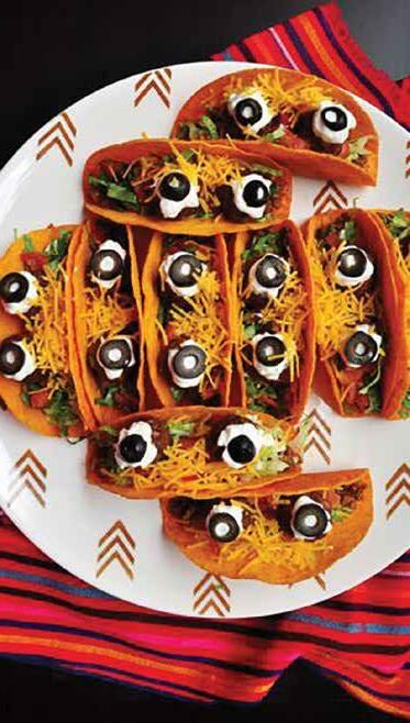 Position 2 meatballs inside the taco shell and add a dollop of sour cream to each. Garnish with olives to make “eyeballs.” Spread the cheese out along to the top for stringy hair.