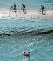 Twee kinderen dobberen op het water, terwijl drie fietsers hoog boven hen voorbij zoeven. De fietsbrug is de Cykelslangen, letterlijk de ‘fietsslang’, in Kopenhagen. De brug is 230 meter lang en verbindt het district Islands Brygge met het bedrijvige Vesterbro. Elke dag passeren er 12.000 fietsers.