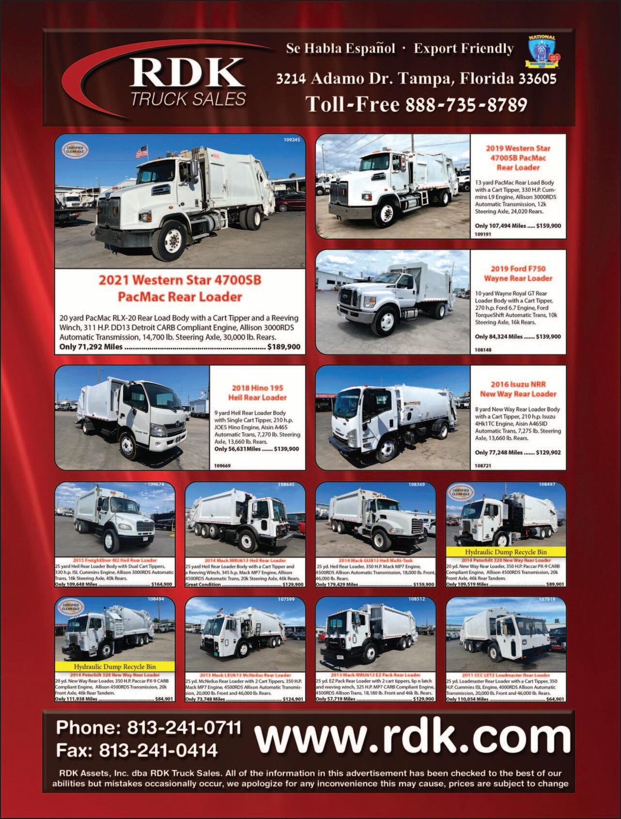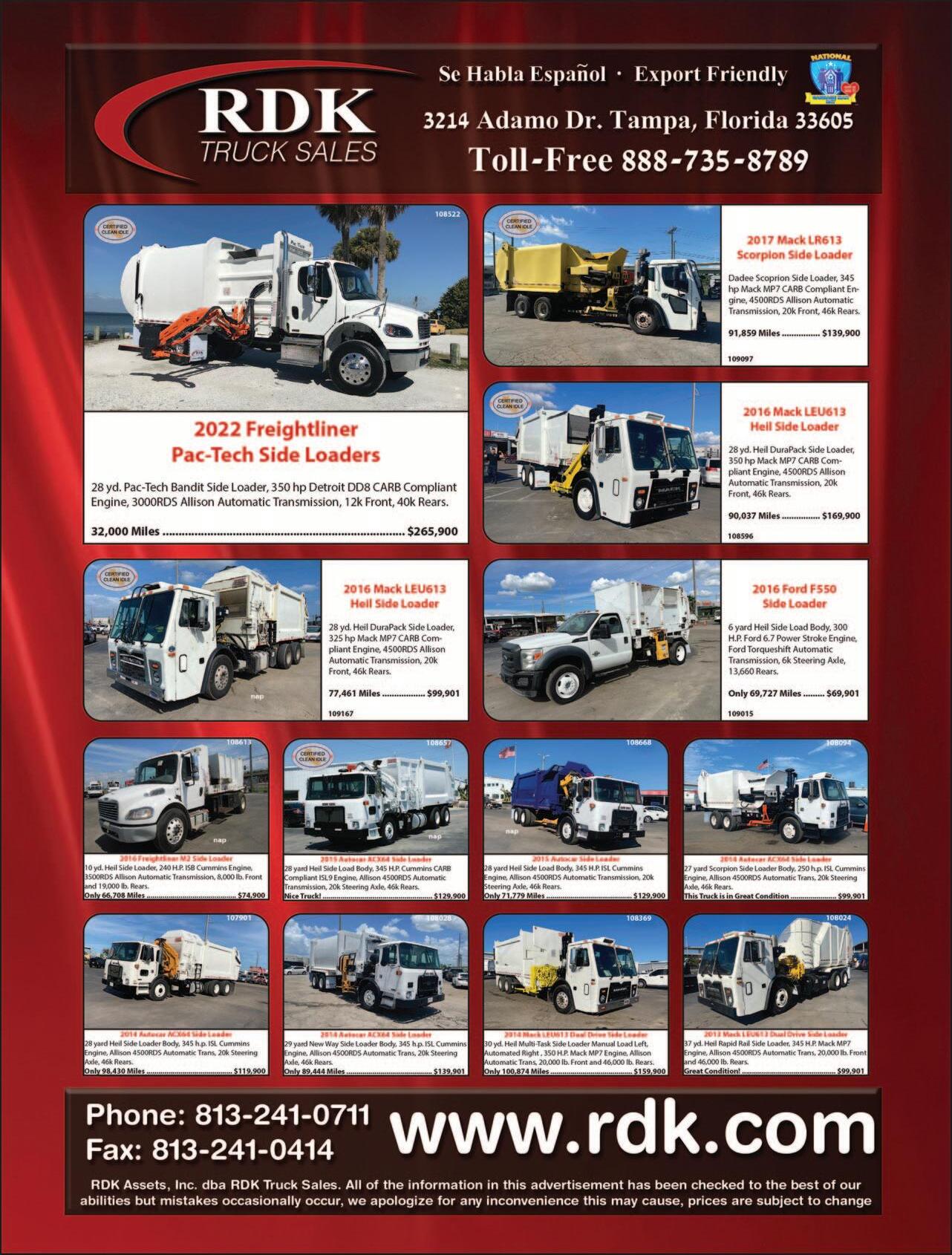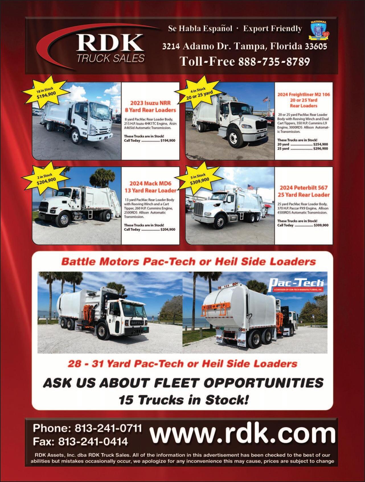 With a large inventory of waste and recycling collection vehicles including non-CDL and CDL single compartment and splitbody rearload packers from 11-32 yd, automated side loaders, front loaders, roll off trucks and more.