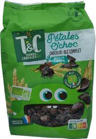 French brand T&C Terres & Céréales relaunched its organic chocolate & wholegrain wheat petals The company says the product is made in France with French wheat and fairtrade chocolate. It is rich in fibre and scores a B on the voluntary front-of-pack nutrition label, NutriScore.