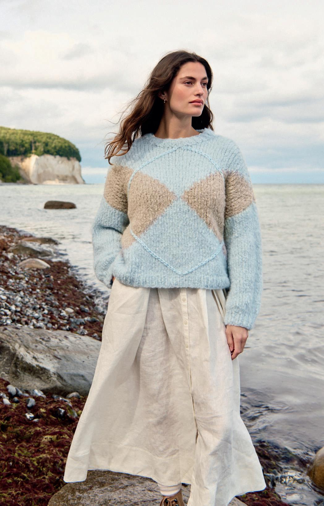 Für diesen Alpaka-Pulli haben wir das legendäre, schottische ArgyleMuster (der modebewusste König Edward VIII trug es zum Golfen!) extrem herangezoomt. Die plastischen Rautenlinien werden nachträglich, Ton-in-Ton, aufgehäkelt.