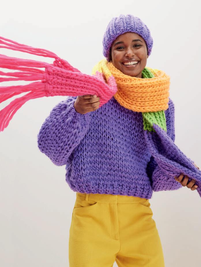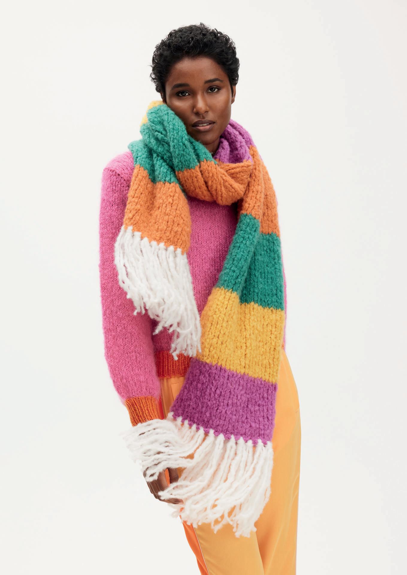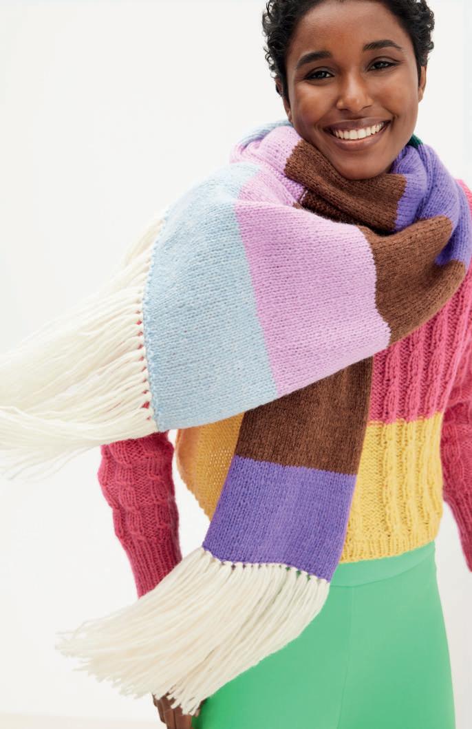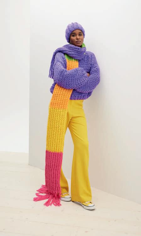 21 - Schal Pink, Gelb und Orange? Ja! Dazu noch Grün und Lila? Nochmal Ja! Super plastisch im Halbpatent und mit Nadeln No. 12 gestrickt, ist dieser Schal in Windeseile fertig. Selbst die Ungeduldigen unter uns werden zugeben: Schneller geht’s nicht.