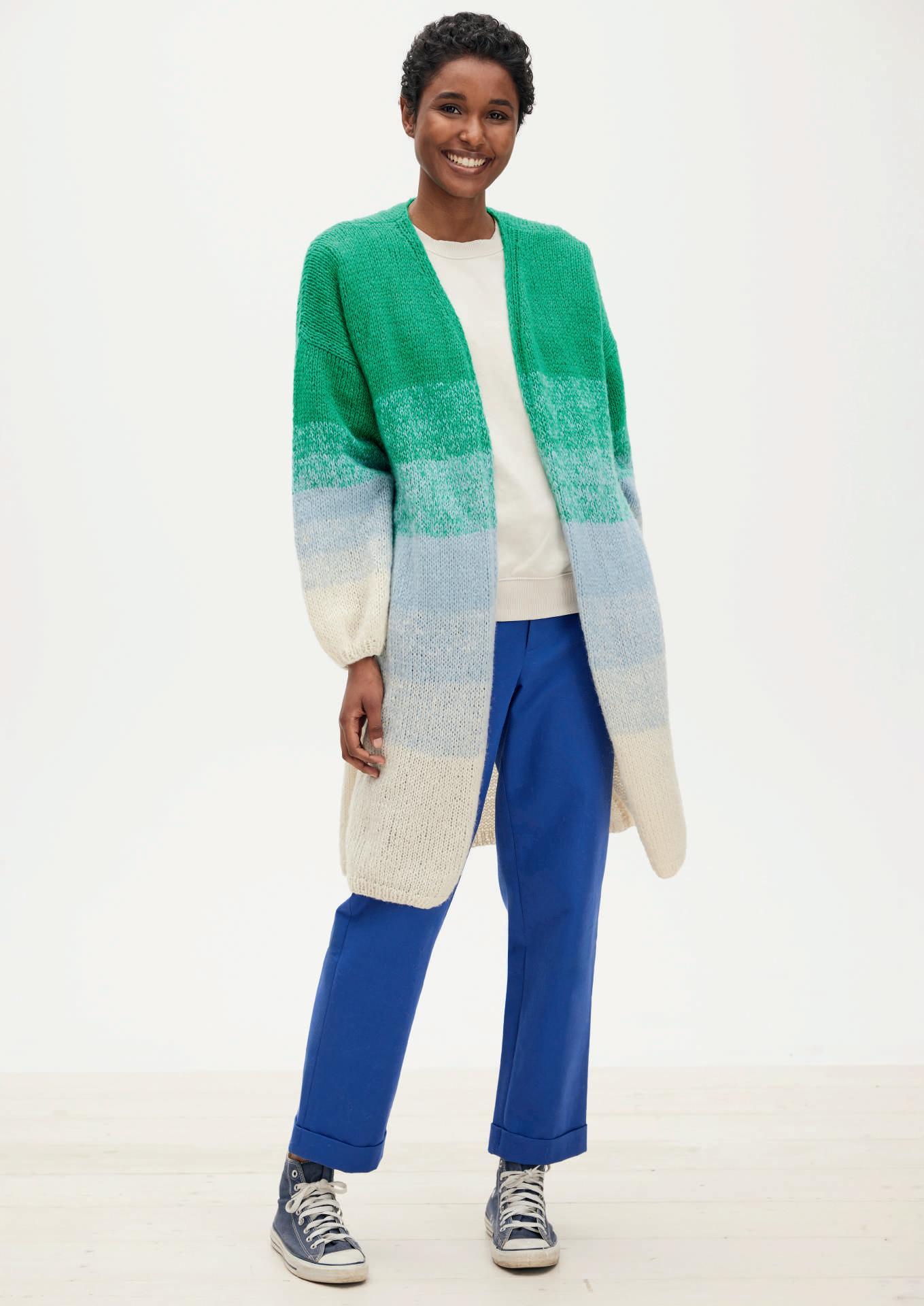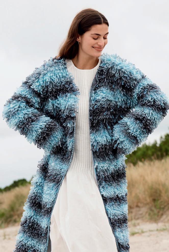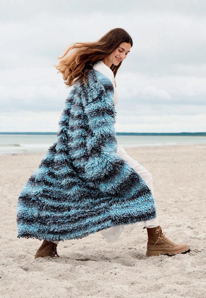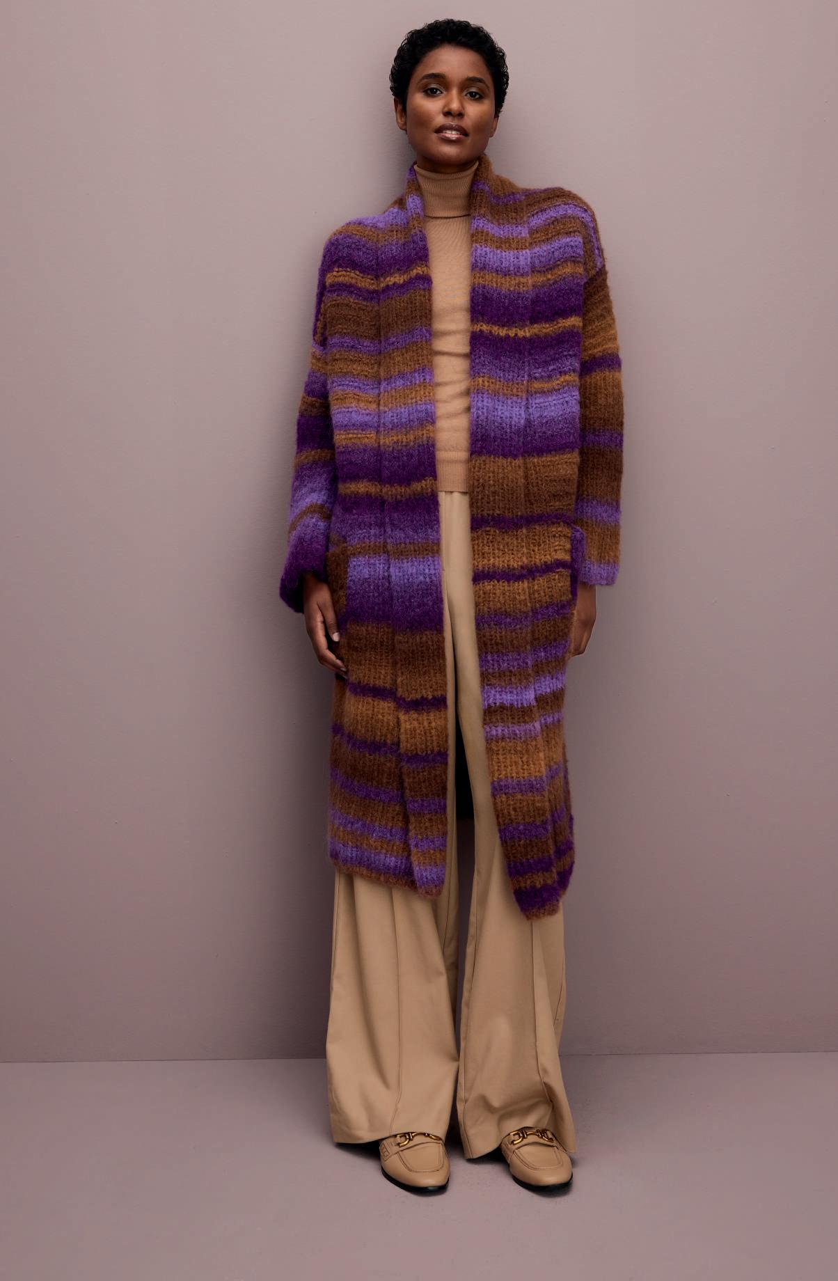 Noch einmal Applaus für Gigante : Dass dieses voluminöse Garn auch bei Mänteln brilliert, zeigt dieses Modell sehr eindrucksvoll. Ohne Schnickschnack, verschlusslos und mit nahezu unsichtbaren Taschen, bleibt die Bühne ganz dem effektvollen Spiel der Farben überlassen.