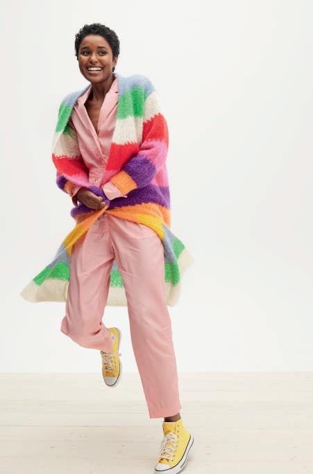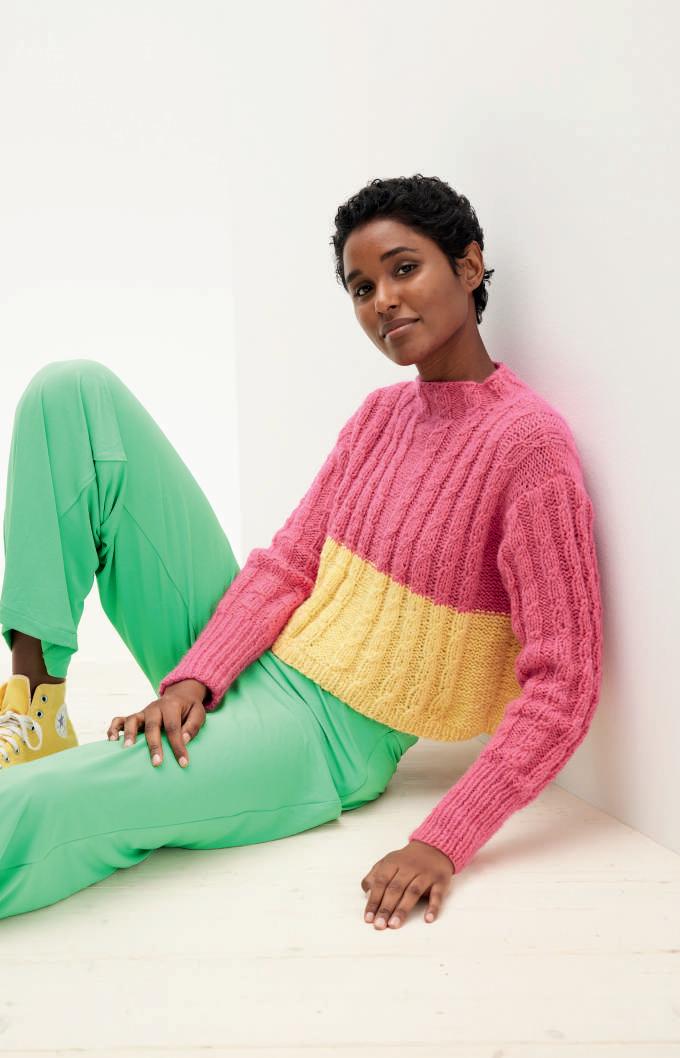 Er punktet mit Rippen aus eng gekreuzten Zöpfen, dem Farbduo Hellgelb und Pink sowie stylischen, weil überlangen Ärmelbündchen. Mutige kombinieren den kurzen Zopfpulli zu Chinos in Knallerfarbe oder gestreiften Pyjama-Pants –aber natürlich ist auch die Lieblingsjeans erlaubt.