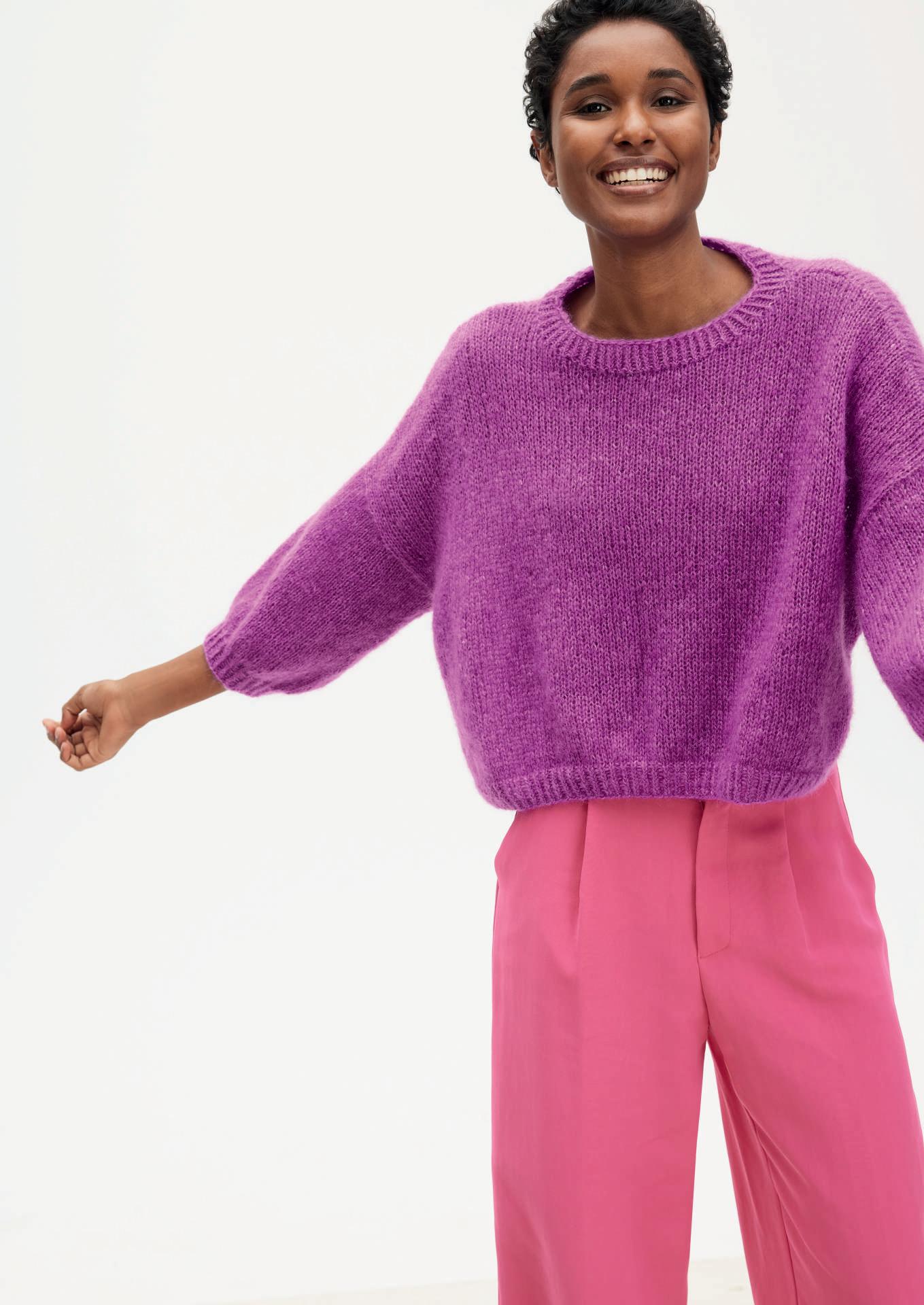 27 - Pullover Lila oder Bonbonrosa –wir konnten uns nicht entscheiden. Daher gibt’s den Pulli (mit Bündchen im Kontrastgarn) gleich zweimal zu sehen. Ihnen wird's bestimmt nicht besser gehen, immerhin stellt das neue Effektgarn ganze 22 Farbtöne zur Qual der Wahl. BASTA & COOL MERINO BIG (violett); BASTA & BRIGITTE NO. 2 (pink)