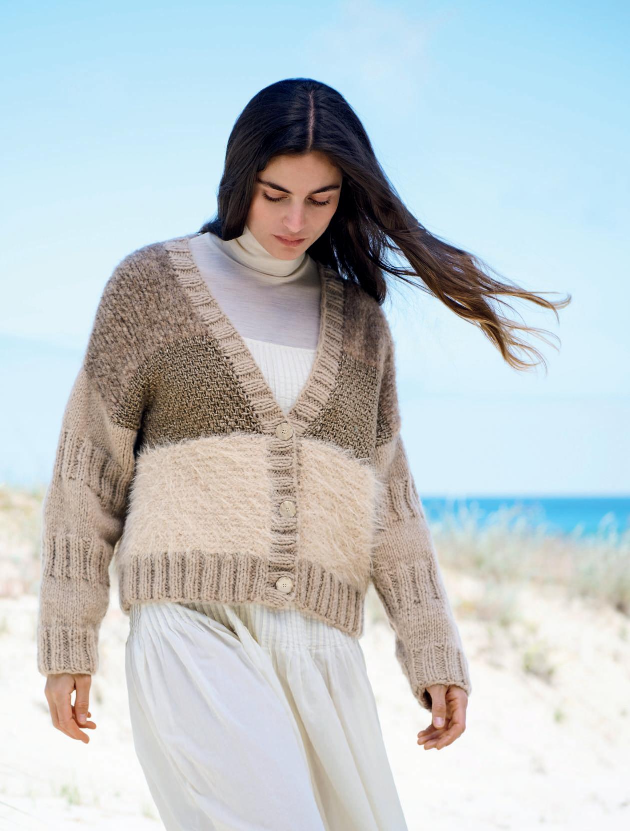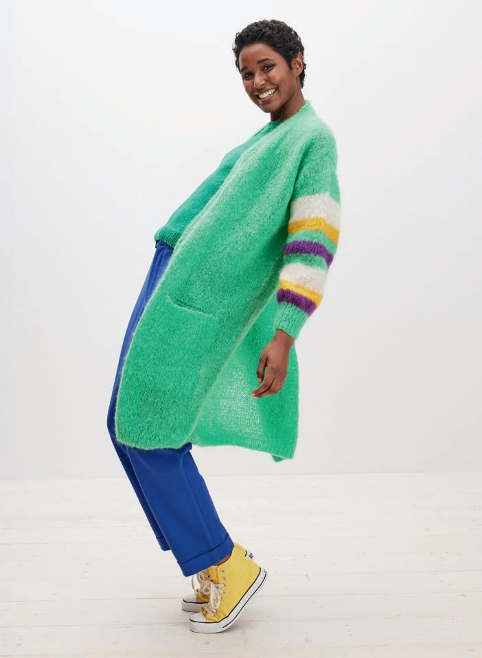 Aus leichtem MohairMerino-Gemisch gestrickt, ist der verschlusslos sportliche Cardigan mit großzügigen Taschen, fröhlichen Ringelärmeln und vor allem mit viel Bewegungsfreiheit ausgestattet. Fehlt eigentlich nur noch das Skateboard. MOHAIR MODA