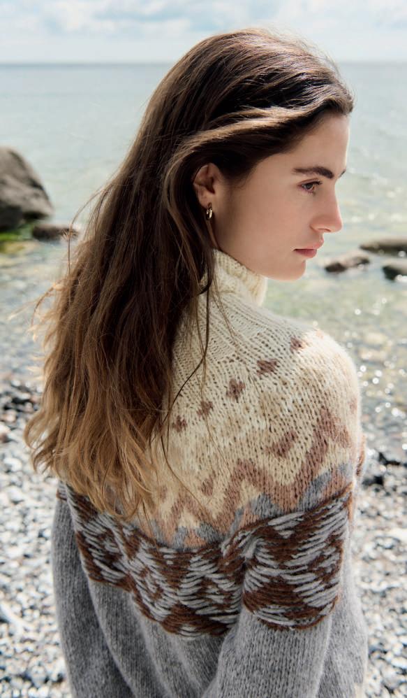 Von einer Winterlandschaft inspiriert wirken die eingestrickten, zartblauen Passagen auf rohweißem Grund. Zugegeben, die Intarsientechnik ist etwas tricky – aber die Mühe lohnt sich, wenn das Ergebnis so sensationell ist.