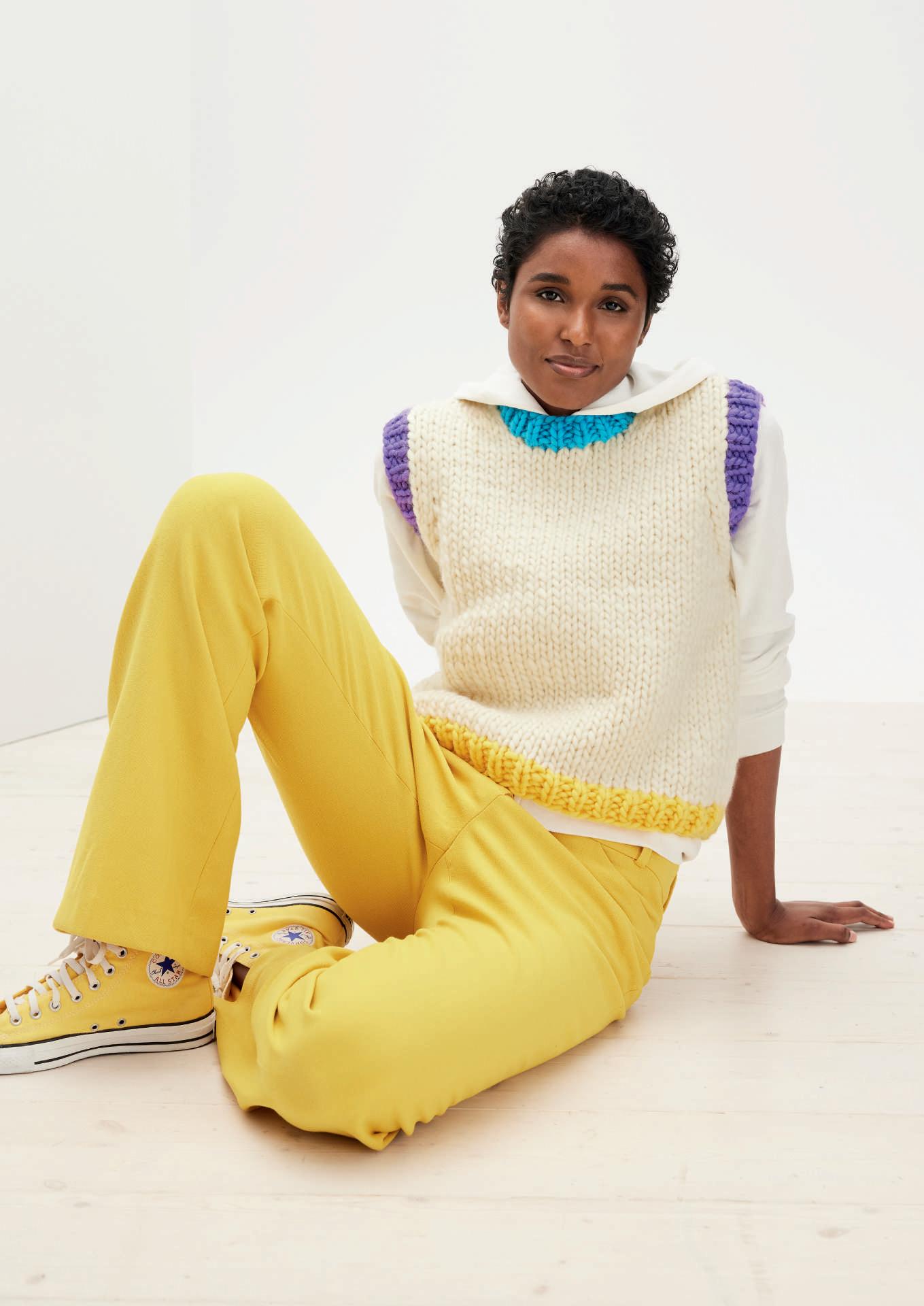 Ein paar betonte Abnahmen an Hals- und Armausschnitten – mehr Herausforderungen erwarten Sie bei diesem frischen, kompakten Pullunder nicht. Ein Blick in den Kleiderschrank entscheidet über die Akzentfarben: Wir fanden Gelb, Violett und Türkis unwiderstehlich.